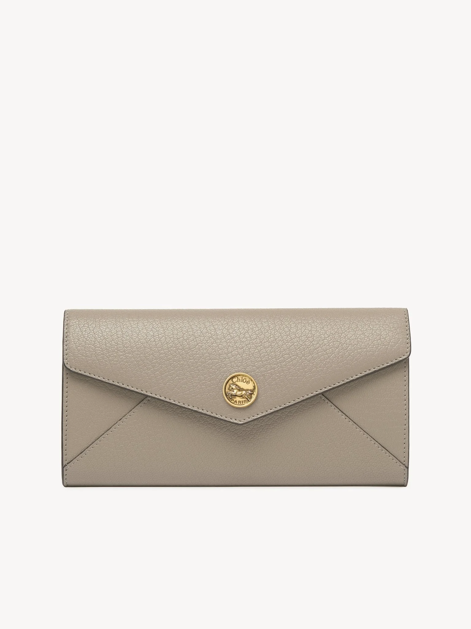 Crafted from grained goatskin, this Envelope long wallet with flap features two main compartments, 12 card slots and a zipped outer pocket. The slim, elongated design is finished with the Maison's golden Horse Medal in a nod to the equestrian world. PRODUCT DETAILS Envelope long wallet with flap in grained goatskin Main lining: Calfskin Inner lining: 65% Polyester, 35% Cotton - 1 flap with snap button closure - 2 main compartments - 12 card slots - 1 flat pocket - 1 zipped outer pocket Comes with a dust bag - Width: 7.9" (20 cm) - Height: 4.7" (12 cm) This long wallet is made from natural leather with a very light and transparent finish. Keep away from water (rain). The wallet may develop smooth or light halos. If the leather gets wet, dry it with a soft white cloth to absorb water. With use, the leather may become marked and shiny. To make this product, Chloe worked with Leather Working Group (LWG) certified leather manufacturers. LWG certifies tanneries based on their water and energy usage, management of chemicals, solid waste, and wastewater. Color: Motty Grey Item code: CH25SP540O9323W