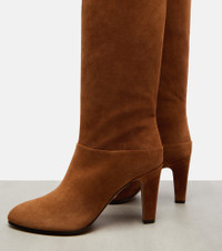 Renowned for its free-spirited aesthetic, Chloe's designs are characterized by romance with a Parisian flair. The Eve over-the-knee boots are made from suede, and the sleek silhouette is defined by 85mm heels and golden, logo-engraved plaques. Product Details - Upper: calf leather (suede) - Lining: leather - Sole: leather insole and sole - Toe shape: pointed toe - Made in Italy - Includes: shoe box, dust bag - Designer color name: Pure Brown - Item color: brown - Item number: P01102190 Size & Fit - True to size - European sizes - 8,5cm-3.5" heel (size EU 38) - 63cm-25" shaft height (size EU 38) - 42cm-16.5" shaft width (size EU 38) - shaft width measured on largest part of boot