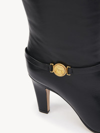 Crafted from supple shiny calfskin, the Eve heeled boots combine a high tube leg with a tapered heel and a classic pointed toe. A leather band around the ankle is embellished with the Maison's signature gold-tone Horse Medal. PRODUCT DETAILS Heeled boot heel height: 3.3" (8.5 cm) Heel-to-toe drop: 3.1" (8 cm) Upper: calfskin Inner sole: lambskin Main lining: lambskin Sole: cowhide Fit true to size, European sizing - Slip-on To make this product, Chloe worked with Leather Working Group (LWG) certified leather manufacturers. LWG certifies tanneries based on their water and energy usage, management of chemicals, solid waste, and wastewater. Color: Black Item code: CH25W13JUY001