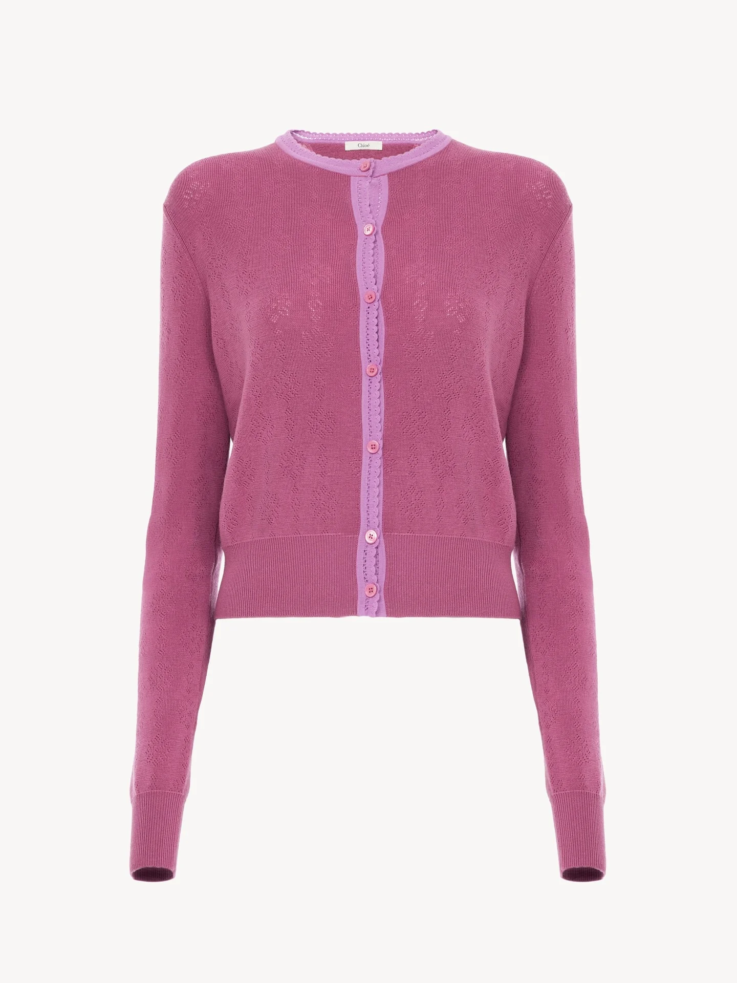 DESCRIPTION Crew-neck fitted cardigan in a lower-impact wool pointelle knit, featuring contrast trims, mother-of-pearl buttons through the front and Chloe logo embroidery at the back of the neck. PRODUCT DETAILS Fitted cardigan outer shell: 100% Wool Secondary material: 100% Cotton Buttons: 100% Mother-of-pearl Fit: fitted - The model is 5'10" (178 cm) and wears a prototype in size S - Knitted cardigan - Mother-of-pearl buttons through front The wool used in this product comes from a farm that respects animal welfare, maintains soil health, protects biodiversity and promotes native species. Color: Lovely Lilac Item code: CH26UMC1268052M CARE INSTRUCTIONS To preserve the integrity of your garment, please refrain from washing, entrusting its care to professional cleaning services for optimal maintenance. This garment cannot withstand any bleaching agent. To maintain its shape, gently iron this garment at a maximum sole plate temperature of 110°C, taking care to avoid any harsh pressure while ironing. Entrust this garment to a specialist for mild cleaning with tetrachloroethylene and solvent F, ensuring its delicate nature is maintained with the most care. To best preserve its form and texture, please do not tumble dry this garment. To maintain its delicate nature, do not wet clean this garment. TRACEABILITY Better traceability is central to improving our materials as well as social and environmental practices. Dyeing: Italy Knitting: Italy