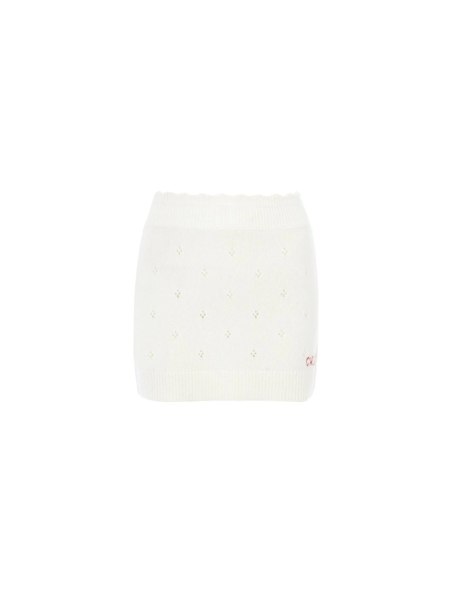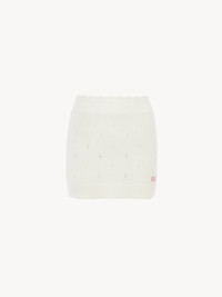 Fitted mini skirt in a lower-impact chunky wool and cashmere knit with an openwork motif, featuring a scalloped waist, ribbed trims and Chloe logo embroidery at the hem. PRODUCT DETAILS Mini skirt outer shell: 70% Wool, 30% Cashmere wool Fit: fitted, mini length - The model is 5'10" (178 cm) and wears a prototype in size 36 - Knitted mini skirt - Slips on The wool used in this product comes from a farm that respects animal welfare, maintains soil health, protects biodiversity and promotes native species. Color: Iconic Milk Item code: CH25WMJ06590107
