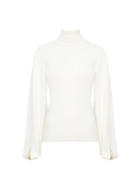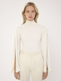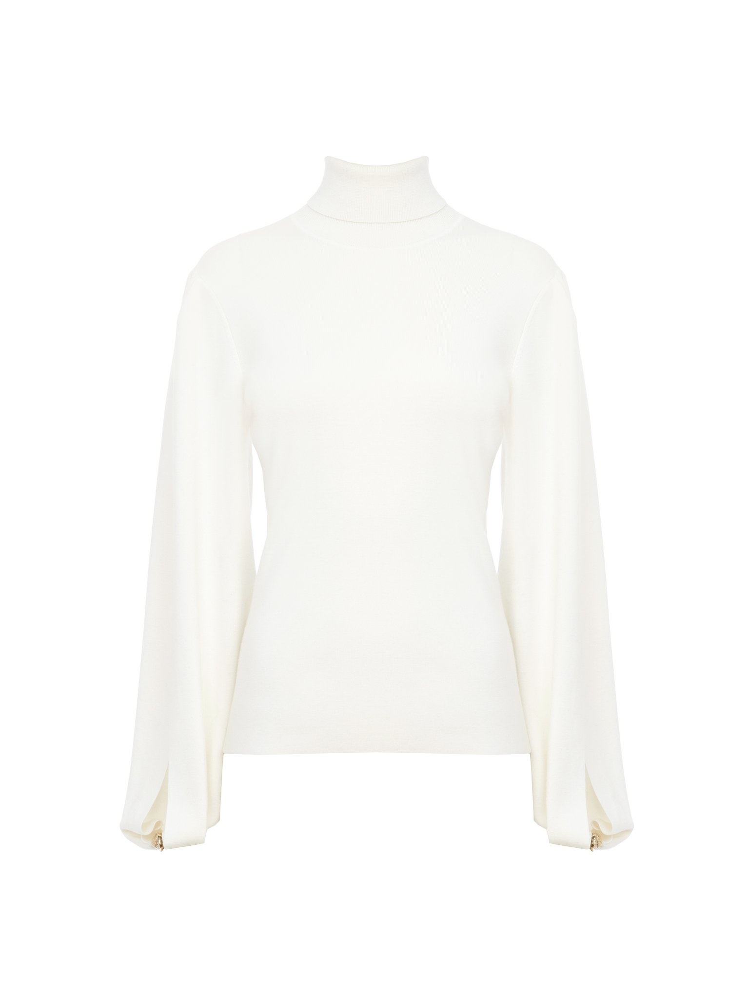 Made from a lower-impact superfine wool knit, this mock-neck sweater contrasts a fitted body with loose, slit sleeves. The day-to-evening piece is elevated at the cuffs with the Maison's signature golden nugget buttons seen on the Fall-Winter 2023 runway. PRODUCT DETAILS Mock-neck sweater main material: 88% Wool, 8% Polyamide, 4% Elastane Cuff buttons: 100% Brass Care: dry cleaning only Fit: fitted - The model is 5'10'' (179 cm) and wears a prototype in size S - Knit sweater - Golden nugget buttons at cuffs - Slips on The wool used in this product comes from a farm that respects animal welfare, maintains soil health, protects biodiversity and promotes native species. Color: Iconic Milk Item code: CHC23WMP24660107