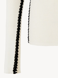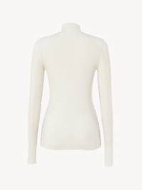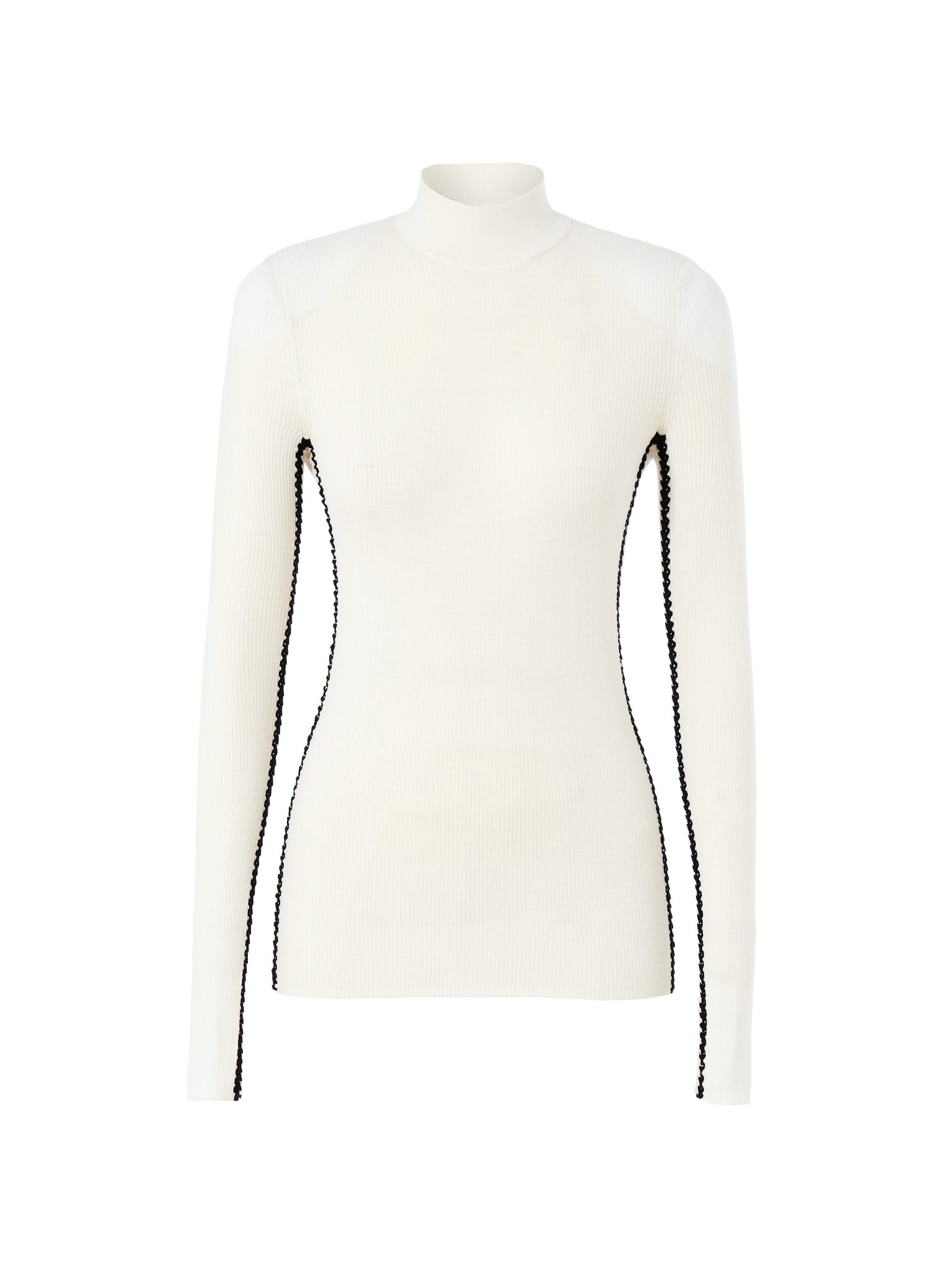 Crafted from a lower-impact fine wool knit, this mock-neck sweater for women has a fitted silhouette with fine ribs that contour the body. Contrast black stitching along the sides and sleeves adds graphic, sporty detail. PRODUCT DETAILS Mock-neck sweater for women main material: 100% Wool Care: dry cleaning only Fit: fitted, long sleeves - The model is 5’10" (178 cm) and wears a prototype in size S - Wool sweater - Slips on The wool used in this product comes from a farm that respects animal welfare, maintains soil health, protects biodiversity and promotes native species. Color: White Powder Item code: CHC22UMP24820109