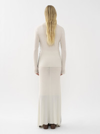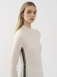 Crafted from lower-impact wool, this fitted mock-neck sweater is embellished with multicolor hand-crochet details through the arms and along the insides of the sleeves. The striking color contrast lends a sporty allure to this elegant ribbed sweater. Pair this sweater with the matching skirt for the full look. PRODUCT DETAILS Fitted mock-neck sweater main material: 100% Wool Care: dry cleaning only Fit: fitted, long sleeves - The model is 5'10" (178 cm) and wears a prototype in size S - Knit top - Slips on The wool used in this product comes from a farm that respects animal welfare, maintains soil health, protects biodiversity, and promotes native species. Color: White Powder Item code: CHC22AMP11520109