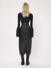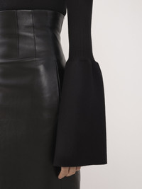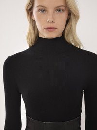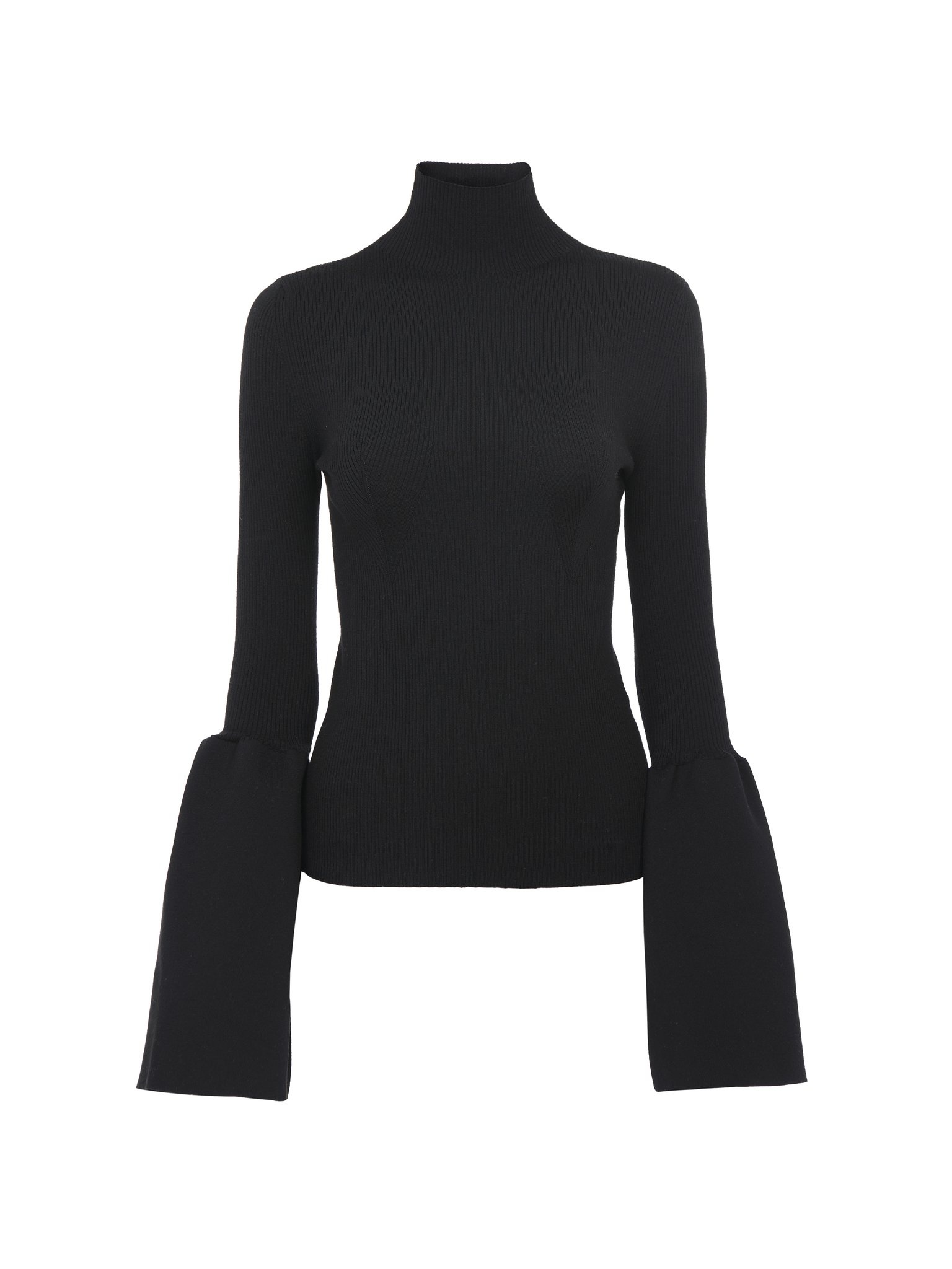 Made from a lower-impact compact wool rib knit, this mock-neck sweater has a feminine, fitted silhouette. The plain bell sleeves counterbalance the ribbed aesthetic, creating a sculptural allure that encapsulates city elegance. Corsetry-inspired stitching details the bust. PRODUCT DETAILS Mock-neck sweater main material: 78% Wool, 18% Polyamide, 4% Polyurethane Care: gentle wash 85°F (30°C) Fit: fitted - The model is 5'10'' (179 cm) and wears a prototype in size S - Ribbed sweater - Slips on The wool used in this product comes from a farm that respects animal welfare, maintains soil health, protects biodiversity and promotes native species. Color: Black Item code: CHC23WMH04662001