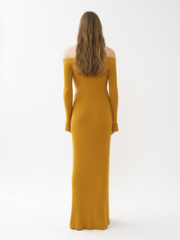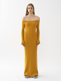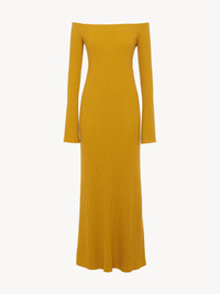 Crafted from a soft, lower-impact wool and cashmere yarn, this off-the-shoulder knit dress combines an ankle-length design with long, trumpet sleeves. The fine ribbed knit elegantly contours the body for a feminine, fitted silhouette. PRODUCT DETAILS Off-the-shoulder knit dress outer shell: 90% Wool, 10% Cashmere Upper part: 61% Wool, 27% Polyamide, 7% Cashmere, 5% Elastane Care: dry cleaning only Fit: fitted, long sleeves, ankle-length - The model is 5’10" (178 cm) and wears a prototype in size S - Ribbed wool dress - Slips on The wool used in this product comes from a farm that respects animal welfare, maintains soil health, protects biodiversity and promotes native species. Color: Sunlight Yellow Item code: CHC22UMR04650780