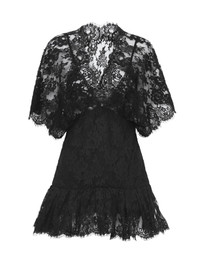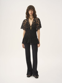 V-neck fitted ruffle top in floral lace with a silk-mix lining, featuring a flouncy hem. PRODUCT DETAILS Fitted ruffle top outer shell: 65% Cotton, 35% Polyamide Lining: 76% Acetate fiber, 24% Silk Braid: 100% Polyamide Fit: fitted - The model is 5'10" (178 cm) and wears a prototype in size 36 - Lace Chloe top - Side hook & zipper fastening This product was made in collaboration with Akanjo, a certified WFTO supplier. Akanjo is a social enterprise located in Madagascar that places equal pay and employees' health & wellbeing at the core of their priorities. A long-standing partner of Chloe for 15 years, Akanjo is also committed to training and promoting craftsmanship. Color: Black Item code: CH25WHT68412001