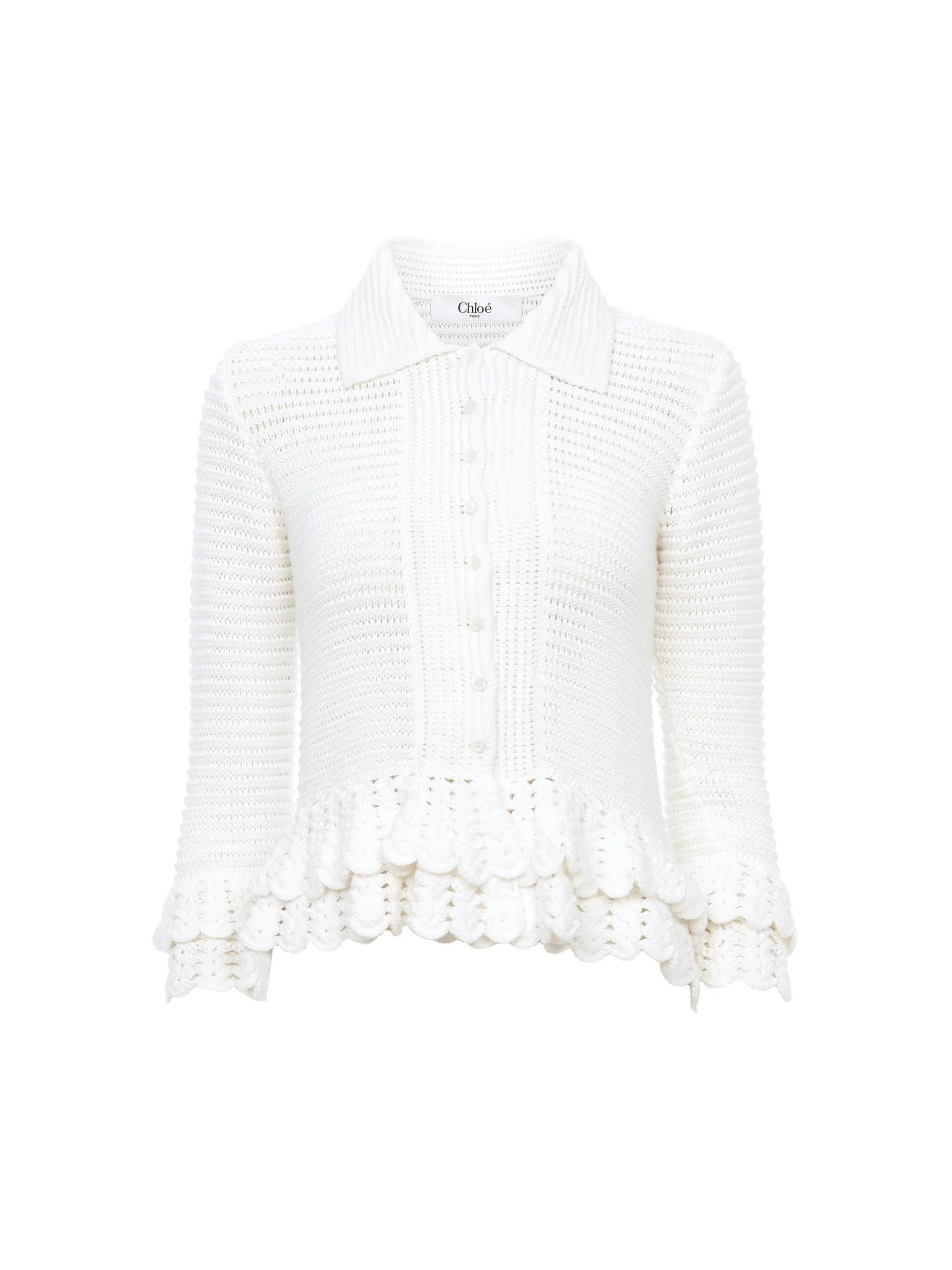 Fitted ruffled cardigan in a crochet knit, featuring mother-of-pearl buttons and layered frills at the hem and cuffs. PRODUCT DETAILS Fitted ruffled cardigan outer shell: 100% Cotton Buttons: 100% Mother-of-pearl Fit: fitted - The model is 5'10" (178 cm) and wears a prototype in size S - Crochet cardigan - Mother-of-pearl buttons through front Care: gentle wash 90°F (30°C) Color: White Item code: CH25UMP05545101