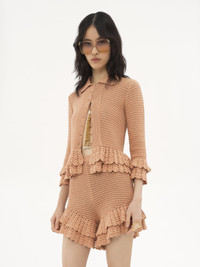 Fitted ruffled cardigan in a crochet knit, featuring mother-of-pearl buttons and layered frills at the hem and cuffs. Wear this cardigan with the matching shorts for the twin set. PRODUCT DETAILS Fitted ruffled cardigan outer shell: 100% Cotton Buttons: 100% Mother-of-pearl Fit: fitted - The model is 5'10" (178 cm) and wears a prototype in size S - Crochet cardigan - Mother-of-pearl buttons through front Care: gentle wash 90°F (30°C) Color: Cheek Item code: CH25UMP0554526W