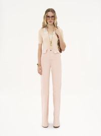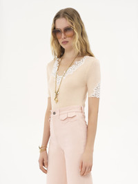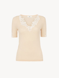 Fitted short-sleeve top in a wool knit embellished with contrast floral guipure along the V-neckline and sleeves. Chloe logo embroidery signs the back. PRODUCT DETAILS Fitted short-sleeve top outer shell: 100% Wool Lacework: 100% Polyester Fit: fitted - The model is 5'10" (178 cm) and wears a prototype in size S - Lace-trim knit top - Slips on Care: dry cleaning only Color: Bleached Orange Item code: CH25UMP1061581G