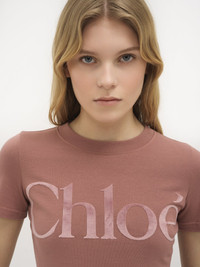 Crew-neck fitted T-shirt in cotton jersey with matte velvet Chloe logo at the front. PRODUCT DETAILS Fitted T-shirt main material: 100% Cotton Front application: 93% Polyester, 7% Elastane Fit: fitted - The model is 5’10” (178 cm) and wears a prototype in size XS - Logo T-shirt - Slips on Care: gentle wash 85°F (30°C) Color: Dried Rose Item code: CH24WJH031846S1