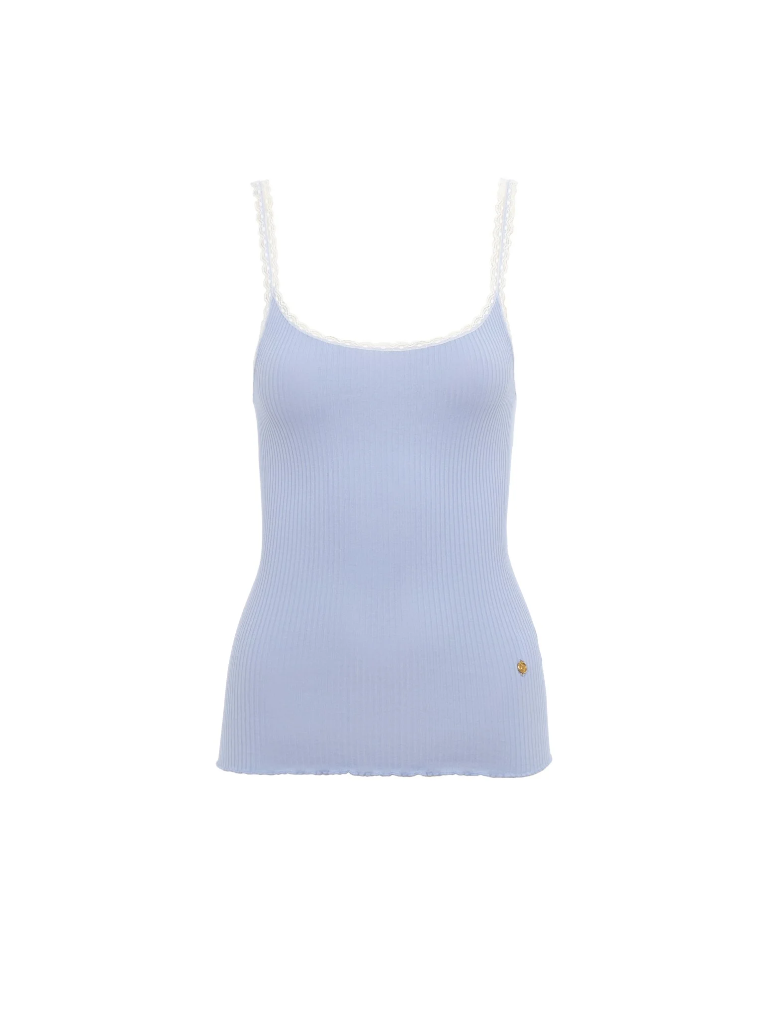 Fitted tank top in tubular cotton with a scalloped lace trim and a gold-tone medal at the hip. PRODUCT DETAILS Fitted tank top outer shell: 100% Cotton Fit: fitted - The model is 5'10" (178 cm) and wears a prototype in size S - Thin-strap tank top - Gold-tone medal at the hip - Slips on Color: Idyllic Blue Item code: CH25WJH0118549U