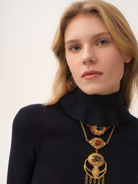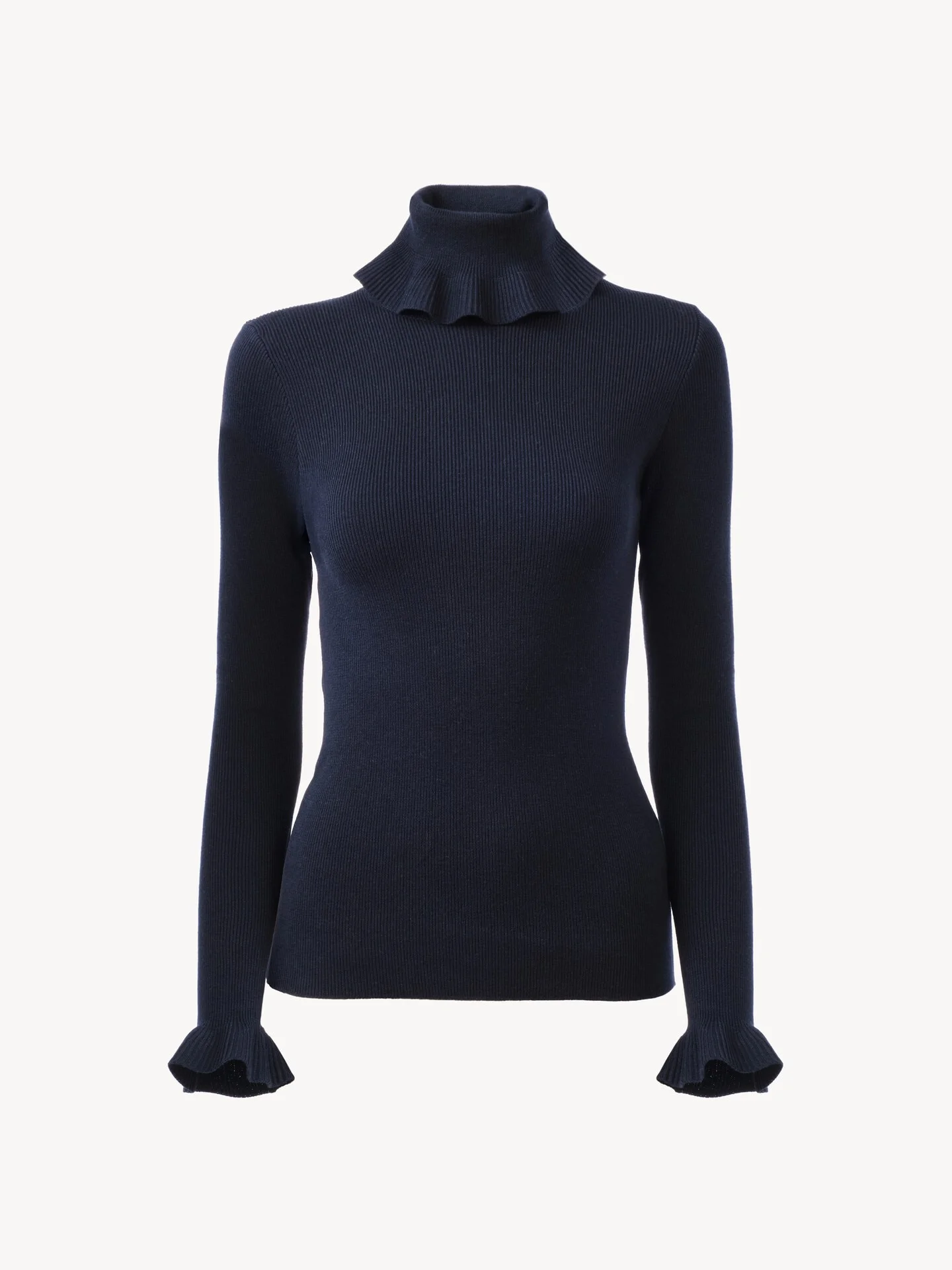 DESCRIPTION Fitted turtleneck sweater in a cotton and wool knit with frilled detail at the neck and cuffs, signed with a gold-tone Chloe logo plate at the back. PRODUCT DETAILS Turtleneck sweater outer shell: 50% Cotton, 50% Wool Fit: fitted - The model is 5'10" (178 cm) and wears a prototype in size S - Fitted sweater - Slips on Color: Navy Item code: CH25AMP145204C4 CARE INSTRUCTIONS To preserve the integrity of your garment, please refrain from washing, entrusting its care to professional cleaning services for optimal maintenance. This garment cannot withstand any bleaching agent. To maintain its shape, gently iron this garment at a maximum sole plate temperature of 110°C, taking care to avoid any harsh pressure while ironing. Entrust this garment to a specialist for mild cleaning with tetrachloroethylene and solvent F, ensuring its delicate nature is maintained with the most care. To maintain its delicate nature, do not wet clean this garment. To best preserve its form and texture, please do not tumble dry this garment.