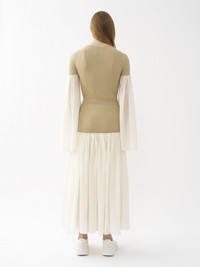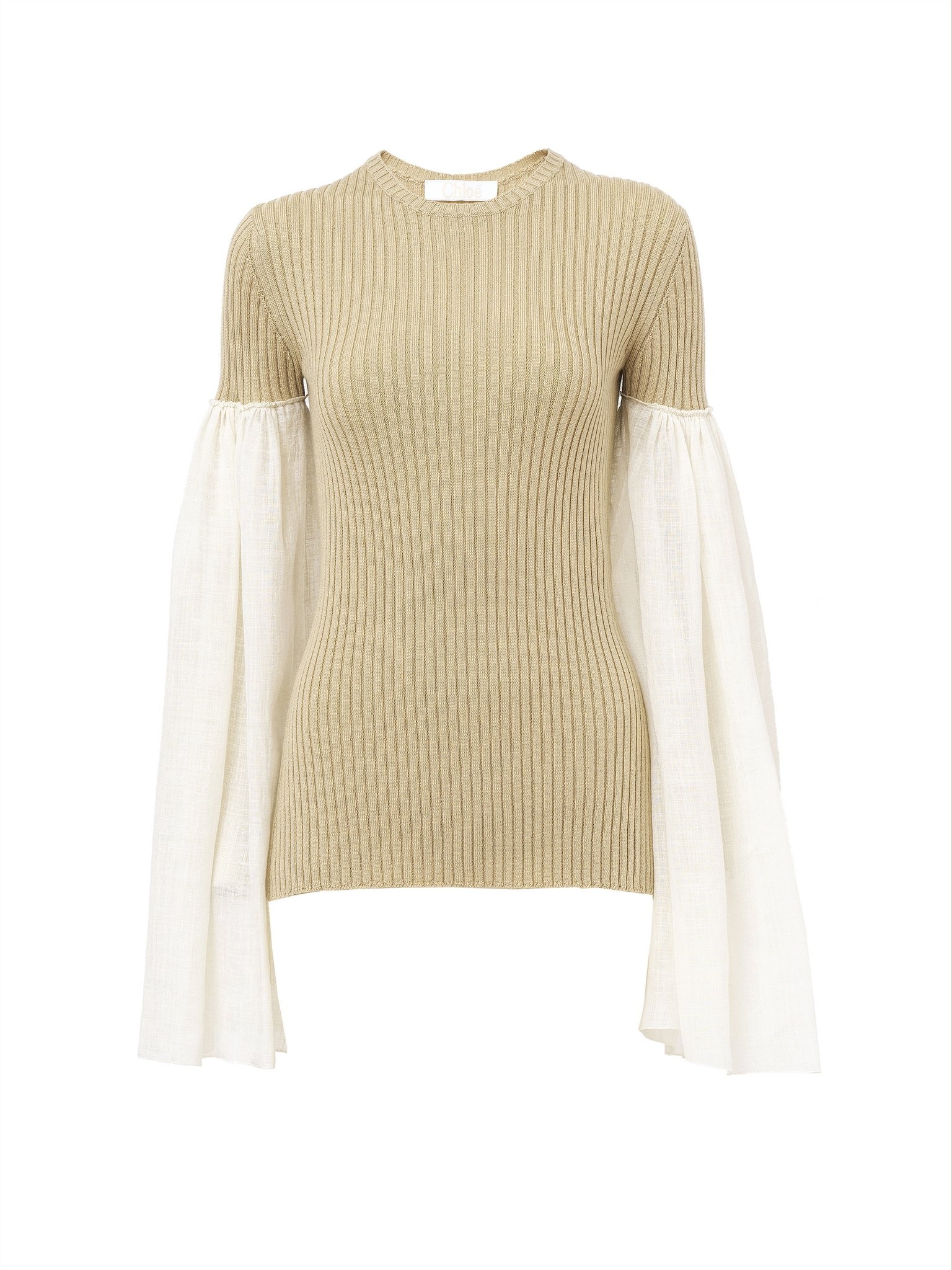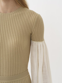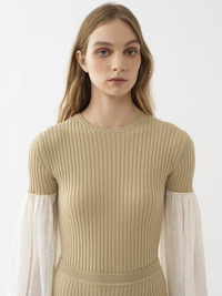 This wide-sleeve top for women is crafted from a textural, contrasting blend of linen silk voile and cashmere-merino ribbed knit. Airy, flowing sleeves are stitched to the fitted, knitted body for a subtle trompe-l'oeil effect. PRODUCT DETAILS Wide-sleeve top for women outer shell: 90% Wool, 10% Cashmere Sleeves: 73% Linen, 27% Silk Care: dry cleaning only Fit: fitted, long sleeves - The model is 5’10" (178 cm) and wears a prototype in size 36 - Bi-fabric knit blouse - Slips on Linen, hemp and ramie cultivations emit less greenhouse gases and require less water compared to other conventional natural fibers, which is why they are considered lower-impact materials by nature. Color: Iconic Milk Item code: CHC22UHT44115107