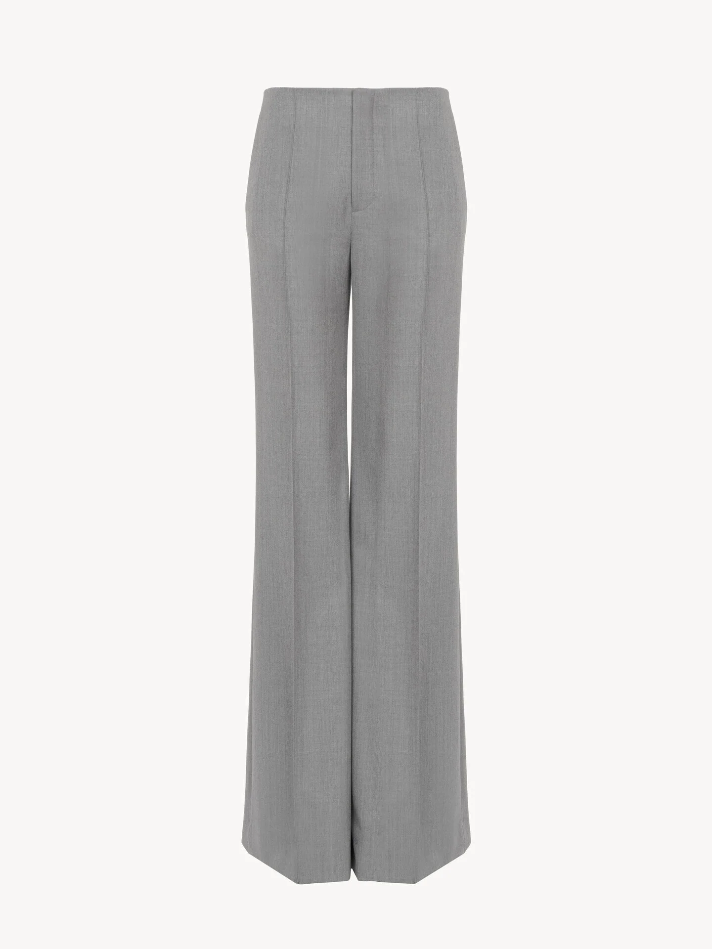 Tailored low-rise flare pants in chiné wool grain de poudre with pintuck creases. PRODUCT DETAILS Flare pants outer shell: 100% Virgin wool Pocket lining: 51% Viscose, 49% Cotton Care: dry cleaning only Fit: low waist, flared - The model is 5'10" (178 cm) and wears a prototype in size 36 - Wool pants - Front hook & zipper fastening - Side pockets - Welt back pockets - V-shaped gap at back Color: Swan Grey Item code: CH24APA3406801J