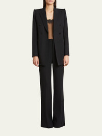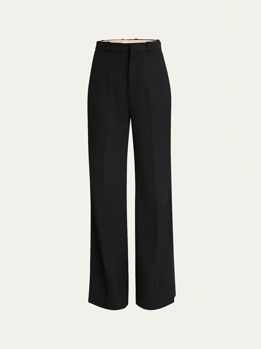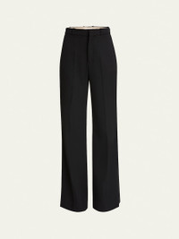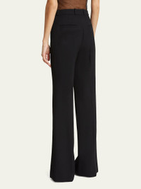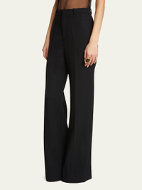 Chloe pants in lower-impact wool grain de poudre with pressed front creases Full length High rise Flare legs Side slip pockets; back pockets Tab/zip fly; belt loops Virgin wool Lining: Silk Made in France Online Inquiries: BGS21_B9WZE| Store Inquiries: #4991549