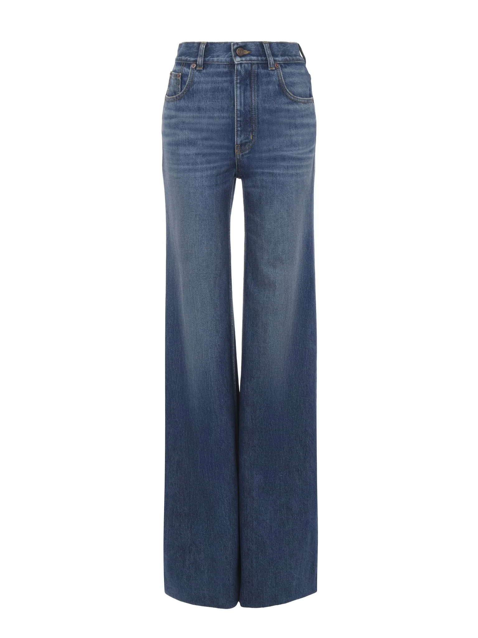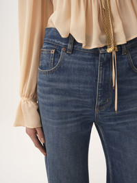High-rise flare jeans in broken blue organic cotton denim. PRODUCT DETAILS High-rise flare jeans outer shell: 100% Cotton Pocket lining: 65% Polyester, 35% Cotton Patch: 100% Calfskin Fit: flared, high waist - The model is 5'10" (178 cm) and wears a prototype in size 24 - High-rise jeans - Front zipper & Chloe-engraved button fastening - Classic 5-pocket design - Belt loops - Leather Chloe patch at back An organic cotton farming system sustains the health of soils, ecosystems and people by eliminating the use of toxic and persistent organic pollutants and increasing water conservation. Color: Hazy Blue Item code: CH25ADP42251427