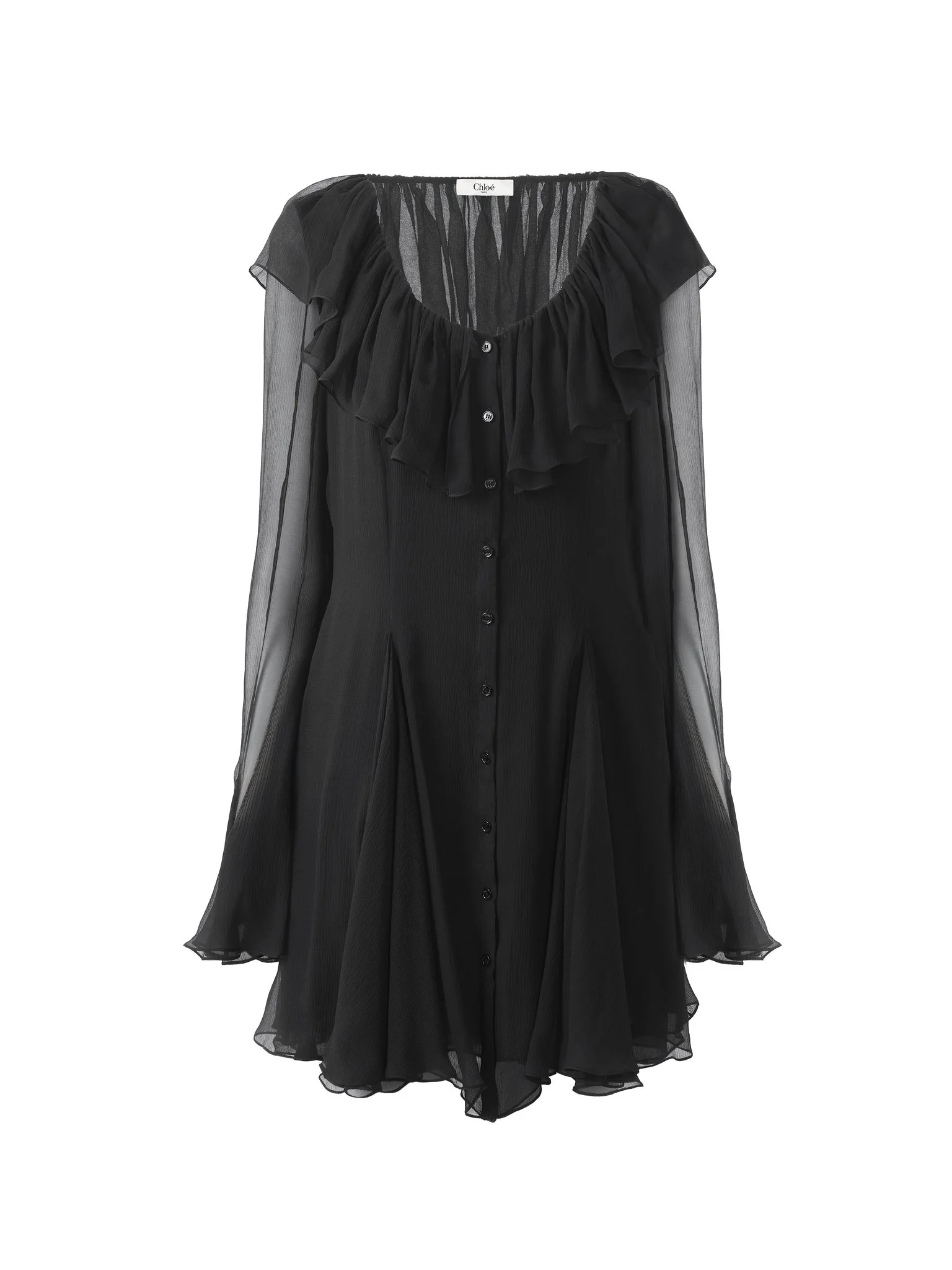 Scoop-neck flared mini dress in organic silk mousseline with a silk-mix lining, featuring flouncy details and mother-of-pearl buttons. PRODUCT DETAILS Flared mini dress outer shell: 100% Silk Lining: 68% Acetate fiber, 32% Silk Buttons: 100% Mother-of-pearl Fit: mini length, fluid - The model is 5'10" (178 cm) and wears a prototype in size 36 - Silk mini dress - Mother-of-pearl buttons through front - Front hook fastening Organic silk manufacturing restricts the use of pesticides, insecticides or harsh chemicals and incorporates methods that respect biodiversity, improve soil quality and reduce water consumption. This product was made in collaboration with Akanjo, a certified WFTO supplier. Akanjo is a social enterprise located in Madagascar that places equal pay and employees' health & wellbeing at the core of their priorities. A long-standing partner of Chloe for 15 years, Akanjo is also committed to training and promoting craftsmanship. Color: Black Item code: CH25WRO19001001