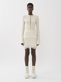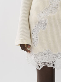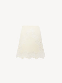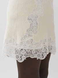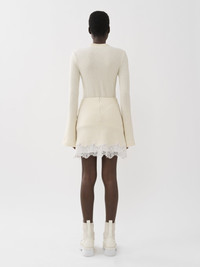 This high-waisted, flared mini skirt is made from a luxurious soft wool rib jersey. Delicate star-inspired guipure inserts embellish the waist and hem for a romantic touch. PRODUCT DETAILS Flared mini skirt main material: 100% Virgin wool Lining: 100% Silk Care: dry cleaning only Fit: high waist, flared, midi-length - The model is 5'10'' (178 cm) and wears a prototype in size 36 - High-waisted wool skirt - Back zip Color: Eden White Item code: CHC23SJU61083112