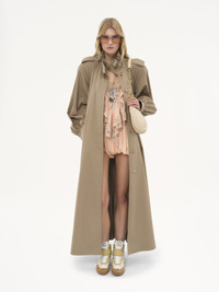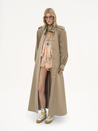 High-neck long trench coat in light organic cotton gabardine, featuring engraved horn buttons, a removable belt and gathered cuffs. Leather buckles and shoulder tabs finish this piece. PRODUCT DETAILS Long trench coat outer shell: 100% Cotton Lining: 100% Cotton Buckle: 50% Calfskin, 50% Zamak Buttons: 100% Horn Fit: straight, long - The model is 5'10" (178 cm) and wears a prototype in size 36 - High-neck trench coat - Engraved horn buttons through front and at cuffs, collar & shoulders - Removable belt with leather buckle - Side pockets - Collar with leather buckle Care: dry cleaning only An organic cotton farming system sustains the health of soils, ecosystems and people by eliminating the use of toxic and persistent organic pollutants and increasing water conservation. Color: Soften Brown Item code: CH25UMA0911820J