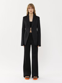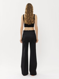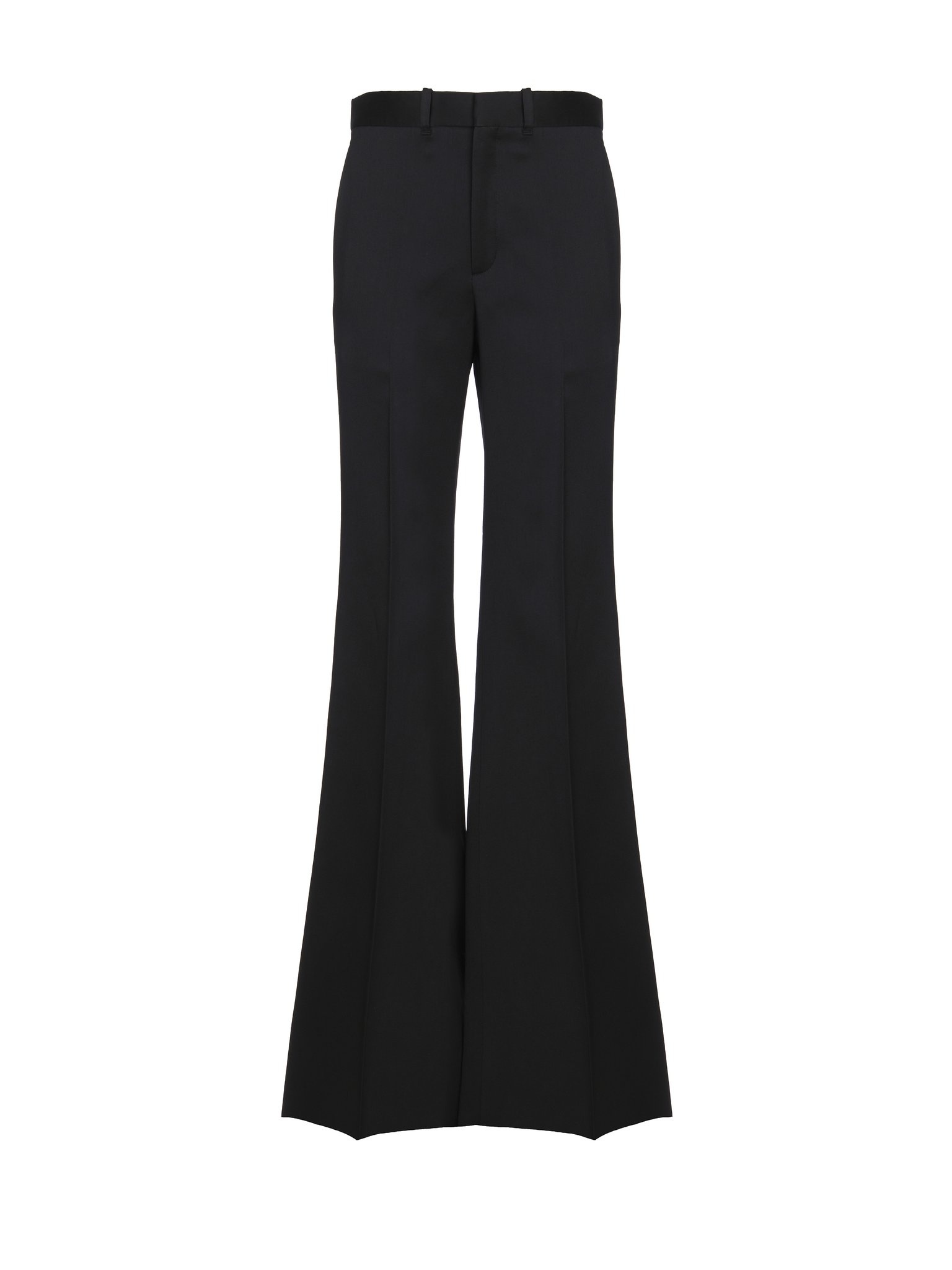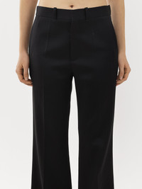 Made from a compact wool and silk crêpe blend, these flared pants have a tailored cut for a chic urban attitude. Pressed creases along the front finish the elegant silhouette. PRODUCT DETAILS Flared pants main material: 86% Wool, 14% Silk Pocket lining: 100% Silk Care: dry cleaning only Fit: regular waist, tailored, flared - The model is 5’10” (178 cm) and wears a prototype in size 36 - Tailored pants - Front hook & zipper fastening - Back pockets - Belt loops Color: Black Item code: CHC23UPA03063001