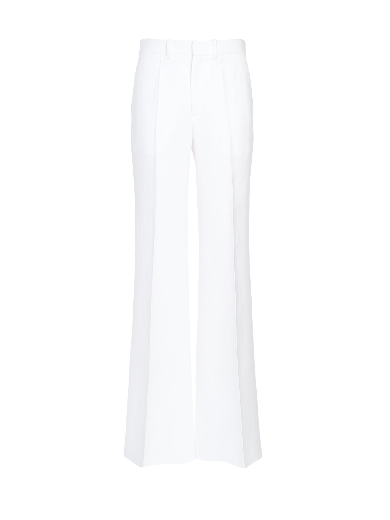 Made from double linen, these flared pants have a softly tailored cut for an effortless summer attitude. Pressed front creases finish the elegant silhouette. PRODUCT DETAILS Flared pants main material: 97% Linen, 3% Cotton Pocket lining: 100% Ramie Care: dry cleaning only Fit: regular waist, flared - The model is 5’10” (178 cm) and wears a prototype in size 36 - Tailored pants - Front hook & zipper fastening - Back pockets - Belt loops Linen, hemp and ramie cultivations emit less greenhouse gases and require less water compared to other conventional natural fibers, which is why they are considered lower-impact materials by nature. Color: White Item code: CHC23UPA03031101