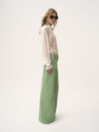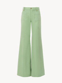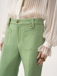 Flared pants in garment-dyed organic cotton canvas, featuring front patch pockets, buttoned belt loops and engraved horn buttons. PRODUCT DETAILS Flared pants outer shell: 100% Cotton Buttons: 100% Water buffalo horn Fit: flared - The model is 5'10" (178 cm) and wears a prototype in size 36 - Flared cotton pants - Engraved horn buttons at front & belt loops - Front zipper - Front patch pockets - Piped back pockets An organic cotton farming system sustains the health of soils, ecosystems and people by eliminating the use of toxic and persistent organic pollutants and increasing water conservation. Color: Off Green Item code: CH25APA08365320