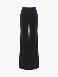Flared tailored pants in soft cotton velvet. PRODUCT DETAILS Flared tailored pants outer shell: 100% Cotton Lining: 51% Viscose, 49% Cotton Fit: tailored, flared - The model is 5'10" (178 cm) and wears a prototype in size 36 - Flared velvet pants - Front hook & zipper fastening - Engraved button - Side pockets - Belt loops Care: dry cleaning only Color: Evening Blue Item code: CH25SPA3601748B