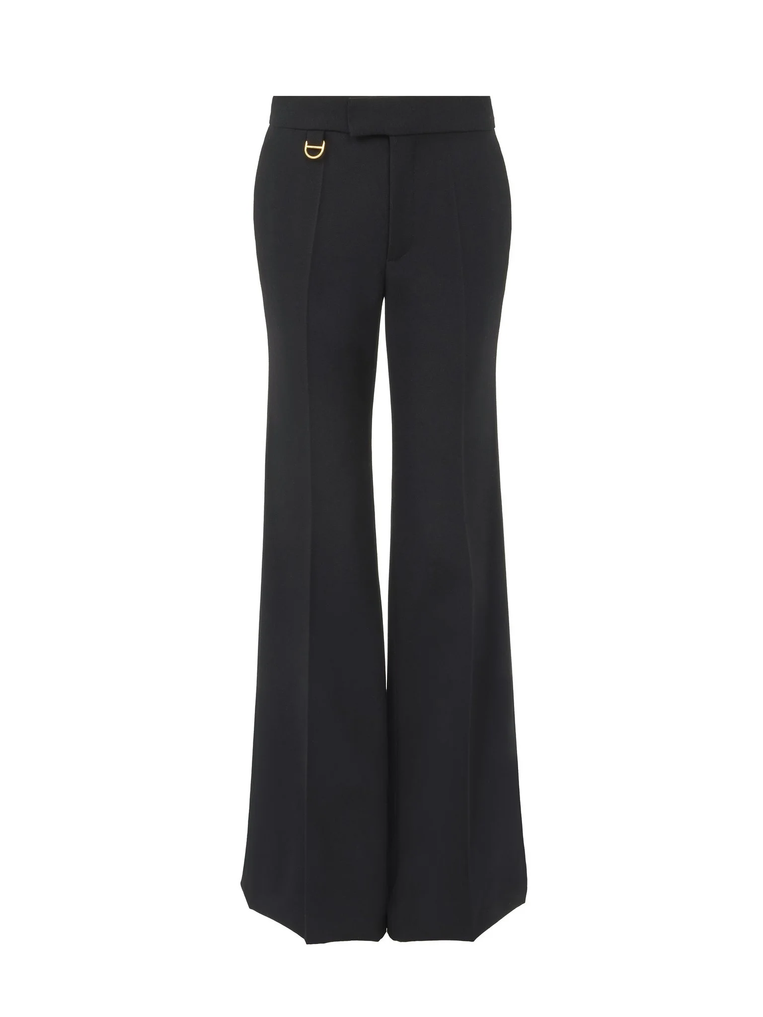 Regular-waisted flared tailored pants in lower-impact wool gabardine, finished with pressed front creases and a gold-tone D-ring at the right hip. PRODUCT DETAILS Flared tailored pants outer shell: 100% Wool Lining: 100% Silk Buttons: 100% Horn Fit: flared, tailored - The model is 5'10" (178 cm) and wears a prototype in size 35 - Tailored wool pants - Front zipper & hook fastening - Side pockets - 2 piped back pockets with engraved horn buttons - Gold-tone D-ring at right hip Care: dry cleaning only The wool used in this product comes from a farm that respects animal welfare, maintains soil health, protects biodiversity and promotes native species. This piece was created in collaboration with Chize Confection. A long-standing partner of Chloe, Chize Confection is a Societe Cooperative de Production (SCOP). This cooperative model is distinguished by its democratic governance, fostering a collaborative and democratic working environment. Chloe has signed a contract to financially support Chize Confection with projects that will benefit its employees. Color: Black Item code: CH25UPA03012001