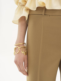 Flared tailored pants in lower-impact wool grain de poudre with pressed creases. PRODUCT DETAILS Flared tailored pants outer shell: 100% Wool Pocket lining: 51% Viscose, 49% Cotton Fit: flared, tailored - The model is 5'10" (178 cm) and wears a prototype in size 36 - Flared wool pants - Front hook & zipper fastening - Engraved button - Front pockets - Belt loops Care: dry cleaning only The wool used in this product comes from a farm that respects animal welfare, maintains soil health, protects biodiversity and promotes native species. Color: Nut Item code: CH25SPA0629920C