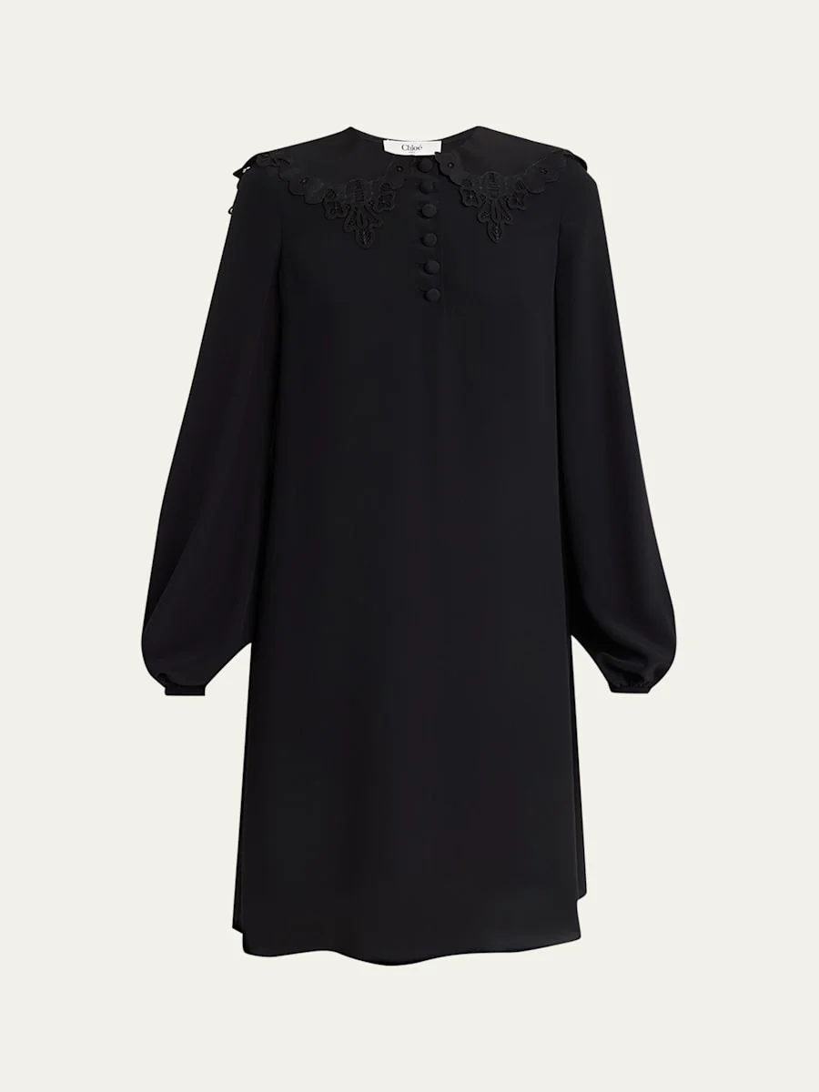 Embroidered with tonal florals along the sailor collar, this lustrous silk dress by Chloe falls just above the knee Collared neckline; partial button front Long blouson sleeves; elastic cuffs Hem hits around the knee A-line silhouette Slipover style Silk/polyester Dry clean, professional cleaning recommended Made in Italy Online Inquiries: BGS21_BB1J3| Store Inquiries: #5438623