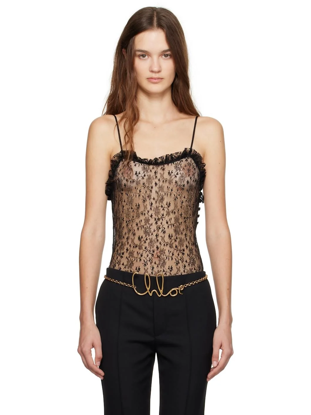 Sheer nylon-blend lace camisole. · Ruffled edge at straight neck · Button closure at side seam · Spaghetti straps Supplier color: Black