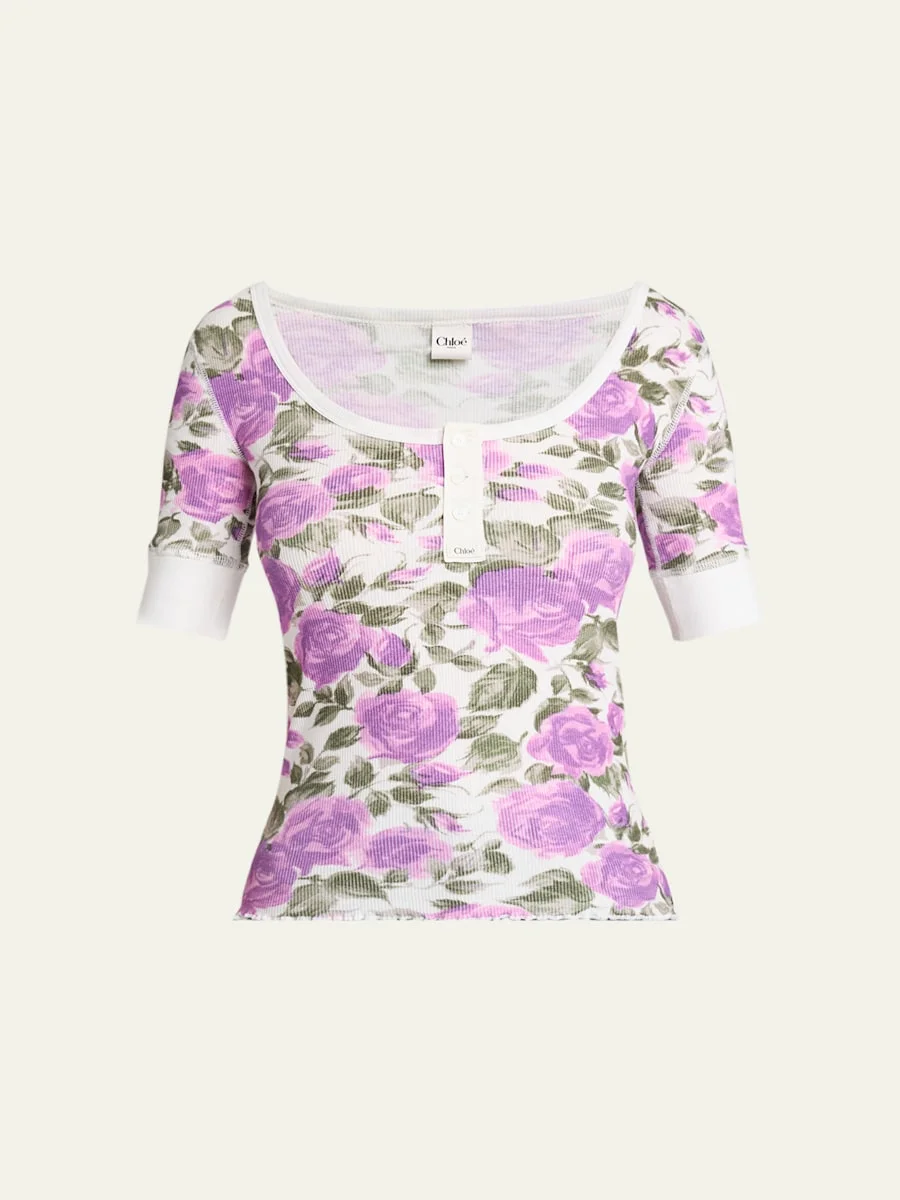 Crafted from rose printed cotton rib, this henley top from Chloe features a threebutton front placket with a logo tab Scoop neckline Short sleeves; banded cuffs Fitted Lettuce edge hem Pullover style Cotton/elastane Professional cleaning recommended Made in Portugal SIZE amp; FITModel measurements: 5'10" tall Model is wearing a US size 4/Small