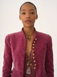 DESCRIPTION Baroque cropped fitted jacket in soft cotton velvet with all-over floral embroidery, featuring gold-tone pumpkin buttons with loop closures. PRODUCT DETAILS Cropped fitted jacket outer shell: 100% Cotton Lining: 51% Viscose, 49% Cotton Embroidery thread: 100% Polyester Fit: fitted - The model is 5'10" (178 cm) and wears a prototype in size 36 - Embroidered velvet jacket - Gold-tone pumpkin buttons through front & at cuffs Color: Burnt Lilac Item code: CH25WVE910916Q7 CARE INSTRUCTIONS To preserve the integrity of your garment, please refrain from washing, entrusting its care to professional cleaning services for optimal maintenance. This garment cannot withstand any bleaching agent. To maintain its shape, gently iron this garment at a maximum sole plate temperature of 110°C, taking care to avoid any harsh pressure while ironing. Entrust this garment to a specialist for mild cleaning with tetrachloroethylene and solvent F, ensuring its delicate nature is maintained with the most care. To maintain its delicate nature, do not wet clean this garment. To best preserve its form and texture, please do not tumble dry this garment. TRACEABILITY Better traceability is central to improving our materials as well as social and environmental practices. Dyeing: Italy Finishing: Italy Weaving: Italy