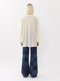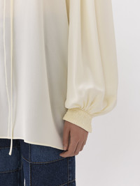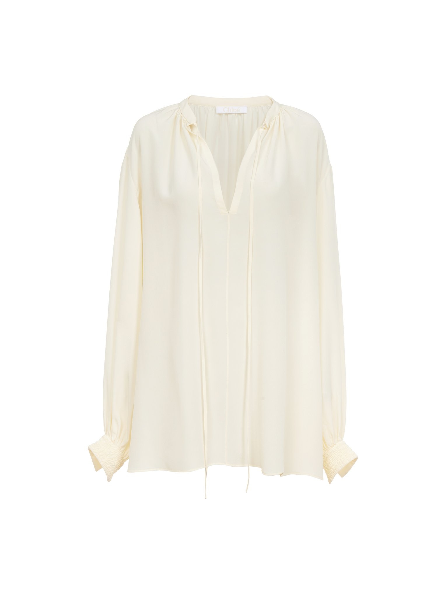 Crafted from organically produced crêpe de chine, this flowy silk blouse has an open neck finished with dangling ties. The generous sleeves are gathered at smocked cuffs. Effortlessly elegant and easy to pair, this piece has a truly relaxed attitude. This product was made in collaboration with Akanjo, a certified WFTO supplier. Akanjo is a social enterprise located in Madagascar that places equal pay and employees' health & wellbeing at the core of their priorities. A long-standing partner of Chloé for 15 years, Akanjo is also committed to training and promoting craftsmanship. PRODUCT DETAILS Flowy silk blouse main material: 100% Silk Care: dry clean only Fit: flowy, long sleeved - The model is 5’10” (178 cm) and wears a prototype in size 36 - Flowy blouse - Neck ties This product is made from organic silk. Organic silk manufacturing restricts the use of pesticides, insecticides or harsh chemicals and incorporates methods that respect biodiversity, improve soil quality and reduce water consumption. Color: Buttercream Item code: CHC23AHT3900424U