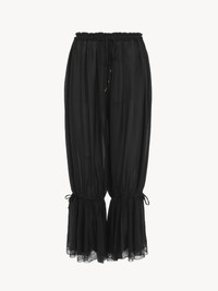 Fluid cropped pants in light organic silk charmeuse with a separate shorts lining. Cinched below the knees by tie fastenings, the pants feature a lace trim at the hem and a drawstring waist detailed with gold-tone metal tips. PRODUCT DETAILS Fluid cropped pants outer shell: 100% Silk Embellishment: 55% Polyamide, 45% Viscose Lining: 68% Acetate fiber, 32% Silk Fit: fluid, cropped - The model is 5'10" (178 cm) and wears a prototype in size 36 - Fluid silk pants - Side pockets - Drawstring waist with metal tips - Separate shorts lining Care: dry cleaning only Organic silk manufacturing restricts the use of pesticides, insecticides or harsh chemicals and incorporates methods that respect biodiversity, improve soil quality and reduce water consumption. Color: Black Item code: CH25UPA08445001
