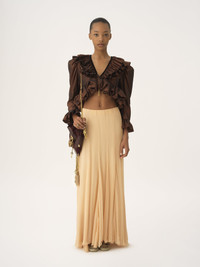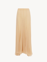 Gathered fluid maxi skirt in organic silk mousseline with a silk-mix lining, detailed with flounces. PRODUCT DETAILS Fluid maxi skirt outer shell: 100% Silk Lining: 68% Acetate fiber, 32% Silk Fit: fluid - The model is 5'10" (178 cm) and wears a prototype in size 36 - Long silk skirt - Back zipper Organic silk manufacturing restricts the use of pesticides, insecticides or harsh chemicals and incorporates methods that respect biodiversity, improve soil quality and reduce water consumption. This product was made in collaboration with Akanjo, a certified WFTO supplier. Akanjo is a social enterprise located in Madagascar that places equal pay and employees' health & wellbeing at the core of their priorities. A long-standing partner of Chloe for 15 years, Akanjo is also committed to training and promoting craftsmanship. Color: Delicate Pink Item code: CH25WJU200016H6