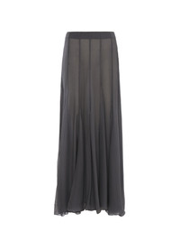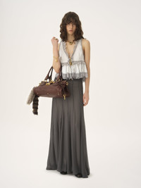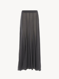 Gathered fluid maxi skirt in organic silk mousseline with a silk-mix lining, detailed with flounces. PRODUCT DETAILS Fluid maxi skirt outer shell: 100% Silk Lining: 68% Acetate fiber, 32% Silk Fit: fluid - The model is 5'10" (178 cm) and wears a prototype in size 36 - Long silk skirt - Back zipper Organic silk manufacturing restricts the use of pesticides, insecticides or harsh chemicals and incorporates methods that respect biodiversity, improve soil quality and reduce water consumption. This product was made in collaboration with Akanjo, a certified WFTO supplier. Akanjo is a social enterprise located in Madagascar that places equal pay and employees' health & wellbeing at the core of their priorities. A long-standing partner of Chloe for 15 years, Akanjo is also committed to training and promoting craftsmanship. Color: Pearly Black Item code: CH25WJU20001010