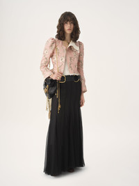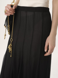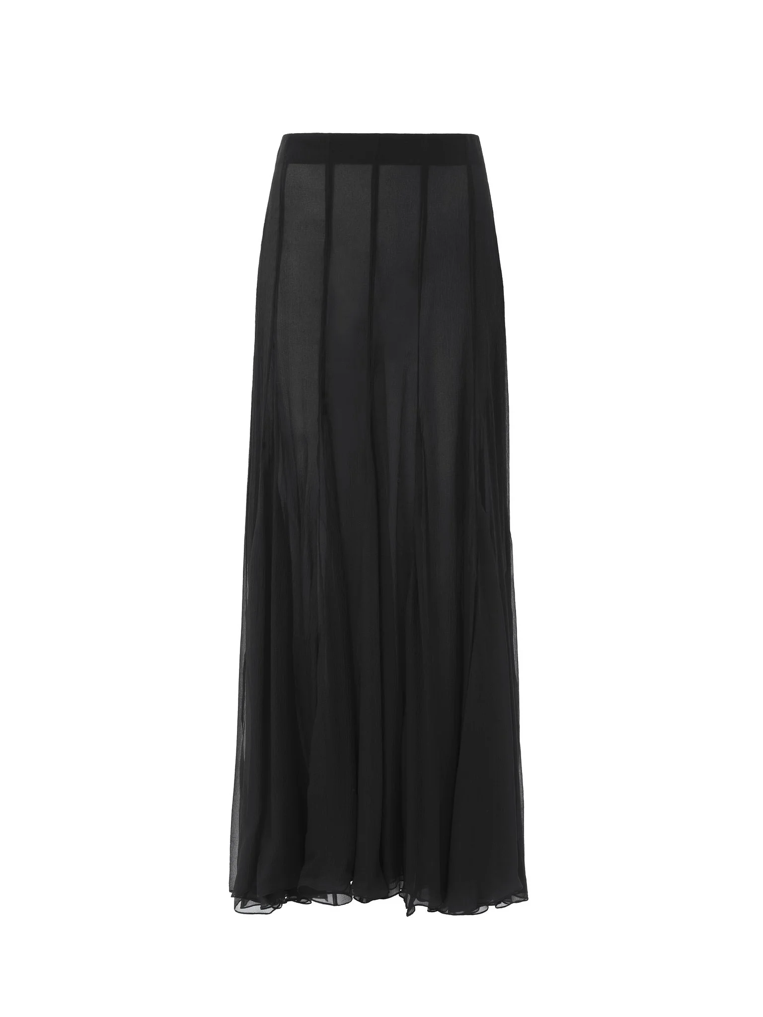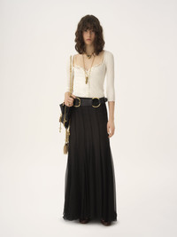 Gathered fluid maxi skirt in organic silk mousseline with a silk-mix lining, detailed with flounces. PRODUCT DETAILS Fluid maxi skirt outer shell: 100% Silk Lining: 68% Acetate fiber, 32% Silk Fit: fluid - The model is 5'10" (178 cm) and wears a prototype in size 36 - Long silk skirt - Back zipper Organic silk manufacturing restricts the use of pesticides, insecticides or harsh chemicals and incorporates methods that respect biodiversity, improve soil quality and reduce water consumption. This product was made in collaboration with Akanjo, a certified WFTO supplier. Akanjo is a social enterprise located in Madagascar that places equal pay and employees' health & wellbeing at the core of their priorities. A long-standing partner of Chloe for 15 years, Akanjo is also committed to training and promoting craftsmanship. Color: Black Item code: CH25WJU20001001