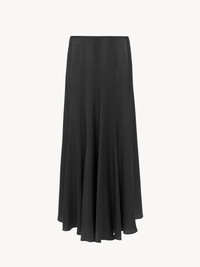 Fluid maxi skirt in washed silk satin. PRODUCT DETAILS Fluid maxi skirt outer shell: 100% Silk Lining: 76% Acetate fiber, 24% Silk Fit: fluid - The model is 5'10" (178 cm) and wears a prototype in size 34 - Long silk skirt - Back hook & zipper fastening This product was made in collaboration with Akanjo, a certified WFTO supplier. Akanjo is a social enterprise located in Madagascar that places equal pay and employees' health & wellbeing at the core of their priorities. A long-standing partner of Chloe for 15 years, Akanjo is also committed to training and promoting craftsmanship. Color: Black Item code: CH25WJU19008001
