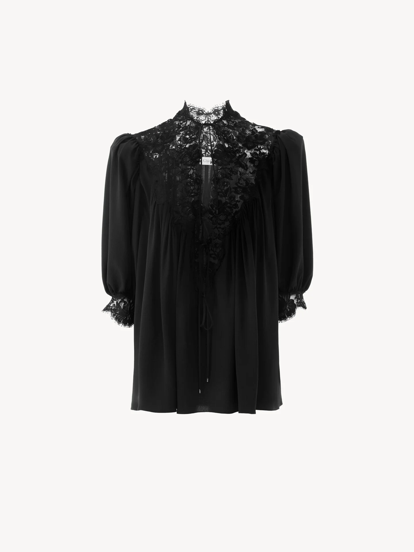 DESCRIPTION Fluid puff-sleeve top in organic silk crepe de chine with lace trims and gathered details. The high neck features dangling ties finished with gold-tone metal tips. PRODUCT DETAILS Puff-sleeve top outer shell: 100% Silk Lacework: 78% Cotton, 22% Polyamide Cuff lace: 76% Cotton, 24% Polyamide Fit: fluid - The model is 5'10" (178 cm) and wears a prototype in size 36 - Fluid silk top - Fabric-covered buttons at back - Dangling ties with hammered metal tips Organic silk manufacturing restricts the use of pesticides, insecticides or harsh chemicals and incorporates methods that respect biodiversity, improve soil quality and reduce water consumption. Color: Black Item code: CH26SHT38005001 CARE INSTRUCTIONS To preserve the integrity of your garment, please refrain from washing, entrusting its care to professional cleaning services for optimal maintenance. TRACEABILITY Better traceability is central to improving our materials as well as social and environmental practices. Dyeing: Italy Finishing: Italy Weaving: Italy Manufacturing : Italy