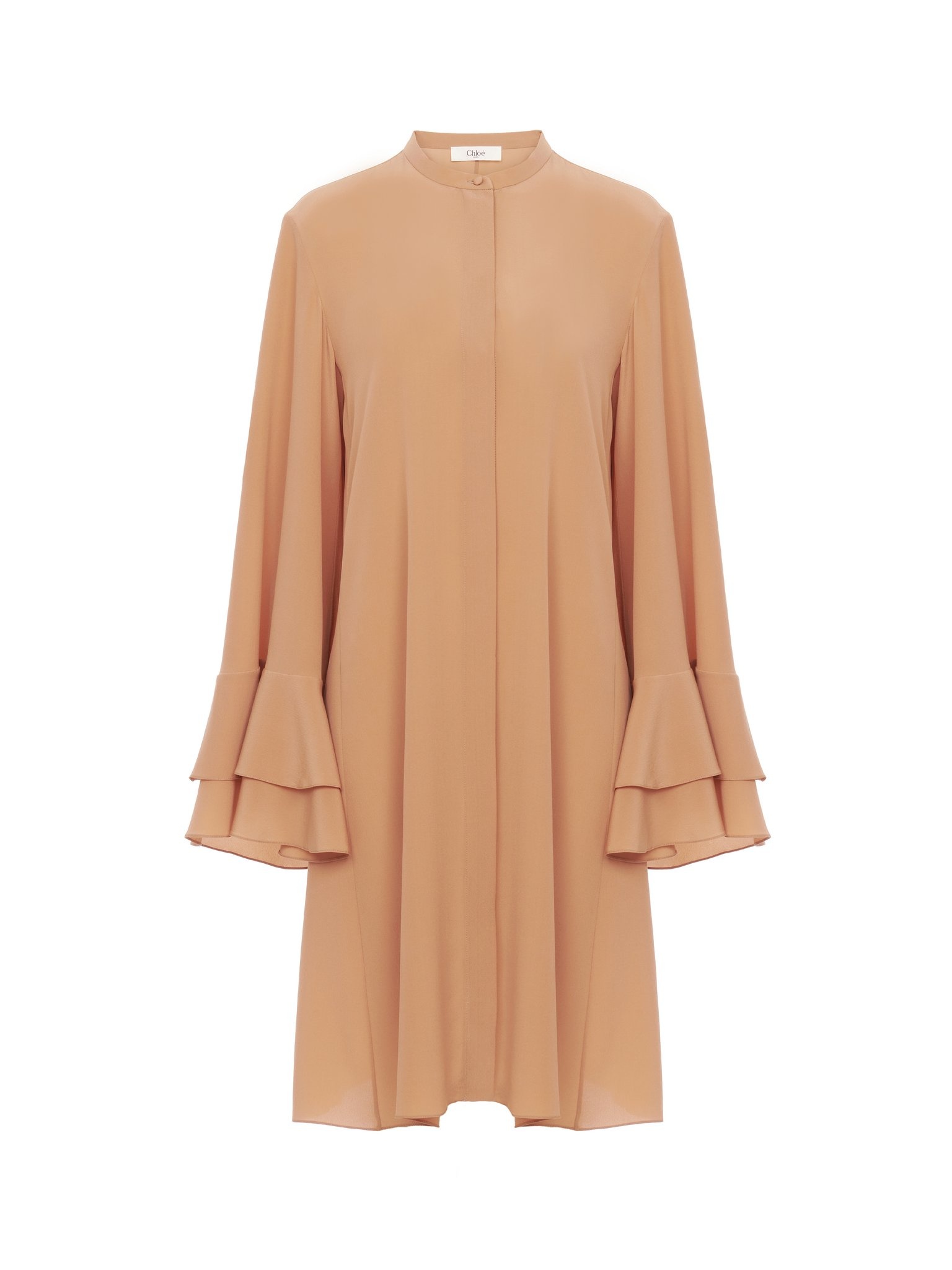 Fluid short dress in organic crepe de chine with flared, ruffled cuffs and mother-of-pearl buttons through the front. PRODUCT DETAILS Fluid short dress main material: 100% Silk Front buttons: 100% Mother-of-pearl Fit: fluid, short - The model is 5’10” (178 cm) and wears a prototype in size 36 - Short silk dress - Mother-of-pearl buttons through front - Fabric-covered button at collar Care: dry cleaning only Organic silk manufacturing restricts the use of pesticides, insecticides or harsh chemicals and incorporates methods that respect biodiversity, improve soil quality and reduce water consumption. This product was made by Marie Helene Couture, a long-standing partner of Chloe based in Morlaas, France. Marie Helene Couture excels in the specialized technique of couture “flou.” Their expertise aligns with the rigorous standards set by the “metiers de la mode, vetement flou” certification, ensuring a high level of professional aptitude in this delicate and skilled art form. Color: Cheek Item code: CH24WRO3912526W