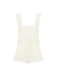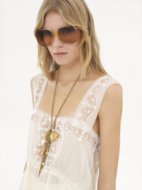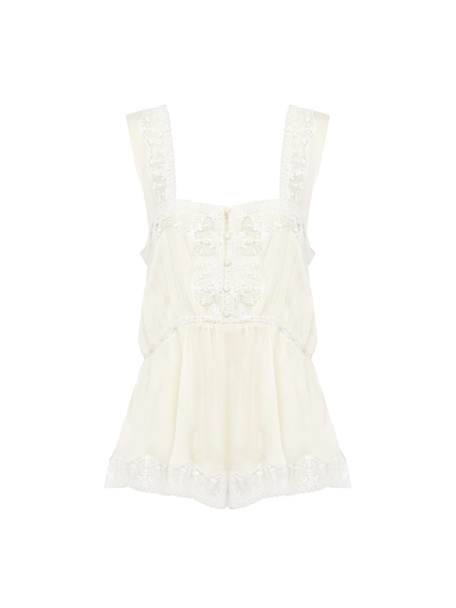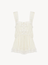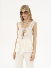Fluid tank top in light silk charmeuse with lace trims, fabric-covered buttons and a drawstring waist. PRODUCT DETAILS Fluid tank top outer shell: 100% Silk Braid: 100% Polyester Secondary braid: 90% Cotton, 10% Polyamide Fit: fluid - The model is 5'10" (178 cm) and wears a prototype in size 36 - Sleeveless silk top - Fabric-covered buttons at front - Drawstring waist Care: dry cleaning only This product was made in collaboration with Akanjo, a certified WFTO supplier. Akanjo is a social enterprise located in Madagascar that places equal pay and employees' health & wellbeing at the core of their priorities. A long-standing partner of Chloe for 15 years, Akanjo is also committed to training and promoting craftsmanship. Color: Dusty White Item code: CH25UHT91329115