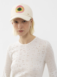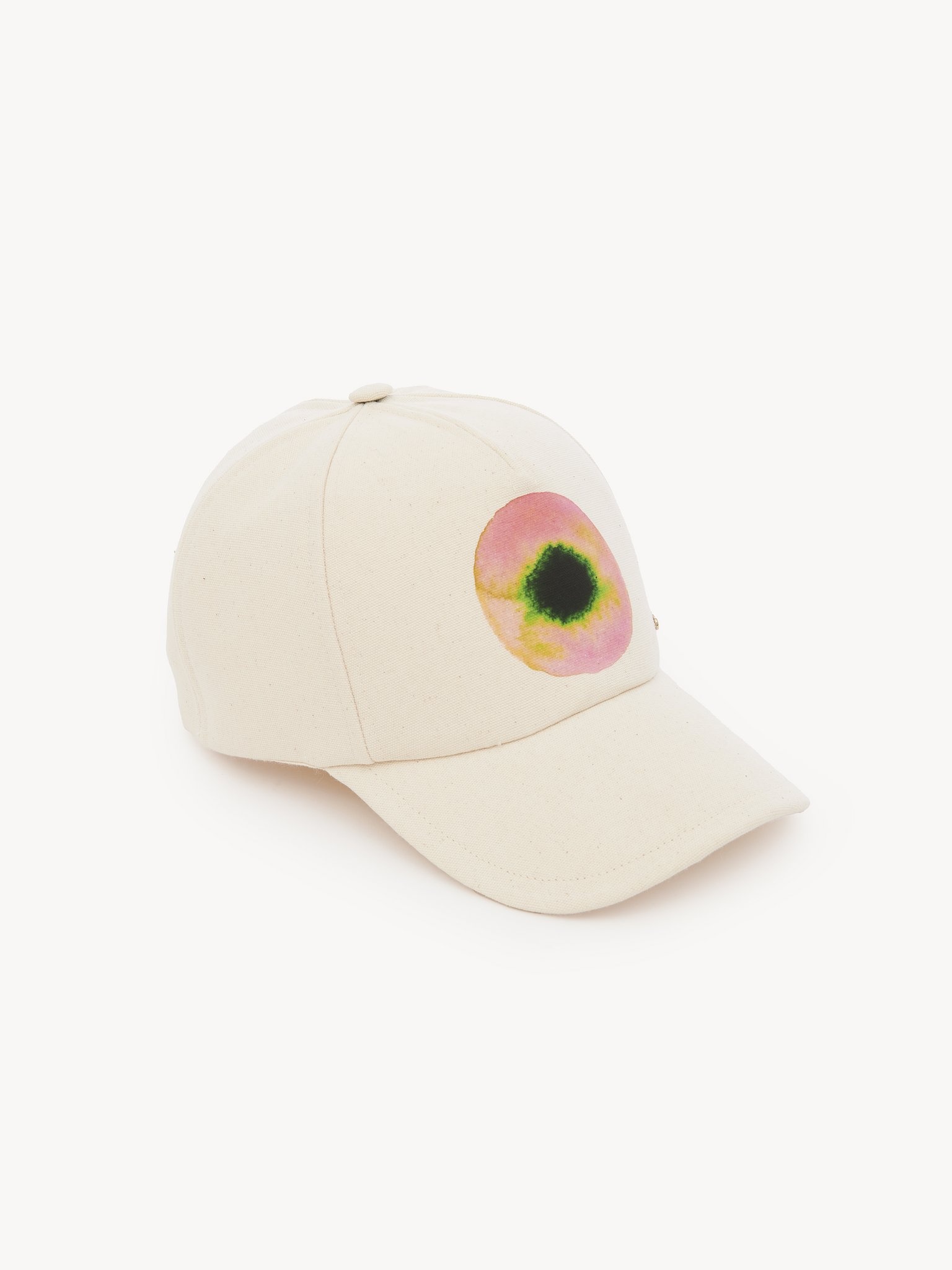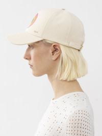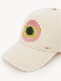 Made from recycled cotton canvas, this cap features a close-up atom print on the front, echoing the Spring-Summer '23 collection's fusion energy theme. An adjustable strap at the back ensures the perfect fit. A subtle gold brass Chloé logo lends a signature touch. Mix and match this cap with other Fusion-printed pieces in the Maison's collection. PRODUCT DETAILS Cap in recycled canvas with Fusion print - One size only - Adjustable strap Recycled cotton keeps its natural softness and inherent quality, with a reduced environmental impact. Using recycled cotton enables us to extend the lifespan of a fiber that has already been produced. Color: White Powder Item code: CHC23UD048CVF109
