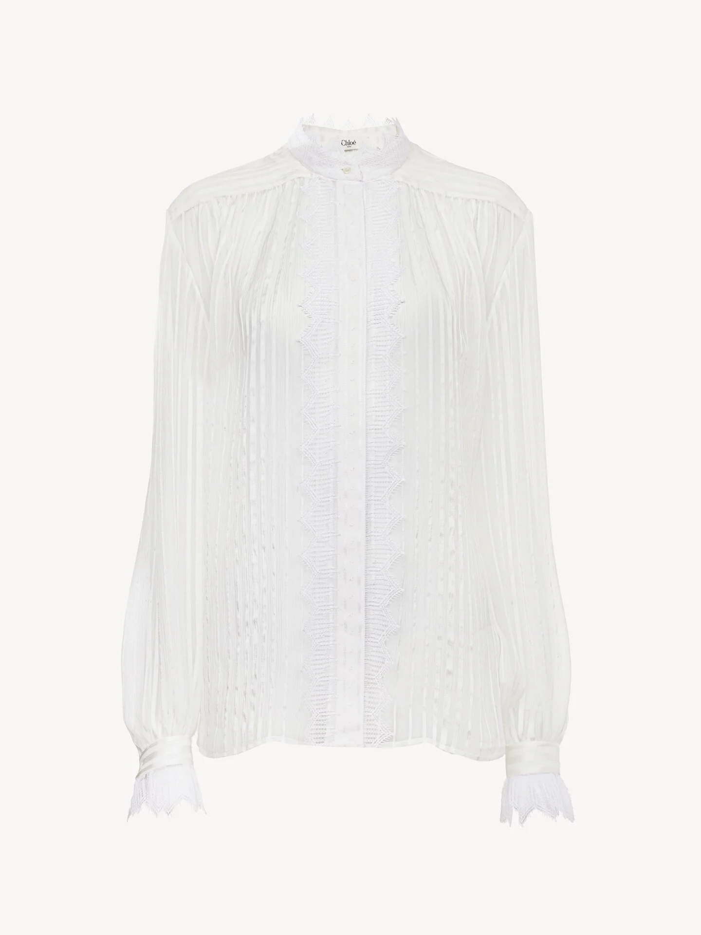 DESCRIPTION Gathered blouse in satin-striped silk mousseline with a silk-mix lining, embellished with lace and pintucks. PRODUCT DETAILS Gathered blouse outer shell: 100% Silk Lining: 68% Acetate fiber, 32% Silk Braid: 83% Polyamide, 17% Viscose Buttons: 100% Mother-of-pearl Fit: straight - The model is 5'10" (178 cm) and wears a prototype in size 36 - Silk blouse - Mother-of-pearl buttons through front & at cuffs Color: Iconic Milk Item code: CH25AHT38917107 CARE INSTRUCTIONS To preserve the integrity of your garment, please refrain from washing, entrusting its care to professional cleaning services for optimal maintenance. This garment cannot withstand any bleaching agent. To maintain its shape, gently iron this garment at a maximum sole plate temperature of 110°C, taking care to avoid any harsh pressure while ironing. Entrust this garment to a specialist for mild cleaning with tetrachloroethylene and solvent F, ensuring its delicate nature is maintained with the most care. To maintain its delicate nature, do not wet clean this garment. To best preserve its form and texture, please do not tumble dry this garment. TRACEABILITY Better traceability is central to improving our materials as well as social and environmental practices. Dyeing: Italy Finishing: Italy Weaving: Italy