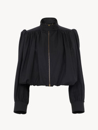 DESCRIPTION Gathered boule jacket in organic cotton canvas with a high collar, gathered shoulders and engraved horn buttons. PRODUCT DETAILS Gathered boule jacket outer shell: 100% Cotton Lining: 100% Cotton Sleeve lining: 51% Viscose, 49% Cotton Buttons: 100% Water buffalo horn Fit: straight - The model is 5'10" (178 cm) and wears a prototype in size 36 - High-neck jacket - Front zipper - Engraved horn buttons at collar & cuffs - Side pockets An organic cotton farming system sustains the health of soils, ecosystems and people by eliminating the use of toxic and persistent organic pollutants and increasing water conservation. Color: Black Item code: CH26SVE20140001 CARE INSTRUCTIONS To preserve the integrity of your garment, please refrain from washing, entrusting its care to professional cleaning services for optimal maintenance. This garment cannot withstand any bleaching agent. To maintain its shape, gently iron this garment at a maximum sole plate temperature of 110°C, taking care to avoid any harsh pressure while ironing. Entrust this garment to a specialist for mild cleaning with tetrachloroethylene and solvent F, ensuring its delicate nature is maintained with the most care. To best preserve its form and texture, please do not tumble dry this garment. To maintain its delicate nature, do not wet clean this garment. TRACEABILITY Better traceability is central to improving our materials as well as social and environmental practices. Dyeing: Italy Finishing: Italy Weaving: Turkiye