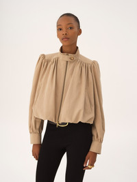 DESCRIPTION Gathered boule jacket in organic cotton canvas with a high collar, gathered shoulders and engraved horn buttons. PRODUCT DETAILS Gathered boule jacket outer shell: 100% Cotton Lining: 100% Cotton Sleeve lining: 51% Viscose, 49% Cotton Buttons: 100% Water buffalo horn Fit: straight - The model is 5'10" (178 cm) and wears a prototype in size 36 - High-neck jacket - Front zipper - Engraved horn buttons at collar & cuffs - Side pockets An organic cotton farming system sustains the health of soils, ecosystems and people by eliminating the use of toxic and persistent organic pollutants and increasing water conservation. Color: Worn Brown Item code: CH26SVE2014026A CARE INSTRUCTIONS To preserve the integrity of your garment, please refrain from washing, entrusting its care to professional cleaning services for optimal maintenance. This garment cannot withstand any bleaching agent. To maintain its shape, gently iron this garment at a maximum sole plate temperature of 110°C, taking care to avoid any harsh pressure while ironing. Entrust this garment to a specialist for mild cleaning with tetrachloroethylene and solvent F, ensuring its delicate nature is maintained with the most care. To best preserve its form and texture, please do not tumble dry this garment. To maintain its delicate nature, do not wet clean this garment. TRACEABILITY Better traceability is central to improving our materials as well as social and environmental practices. Dyeing: Italy Finishing: Italy Weaving: Turkiye