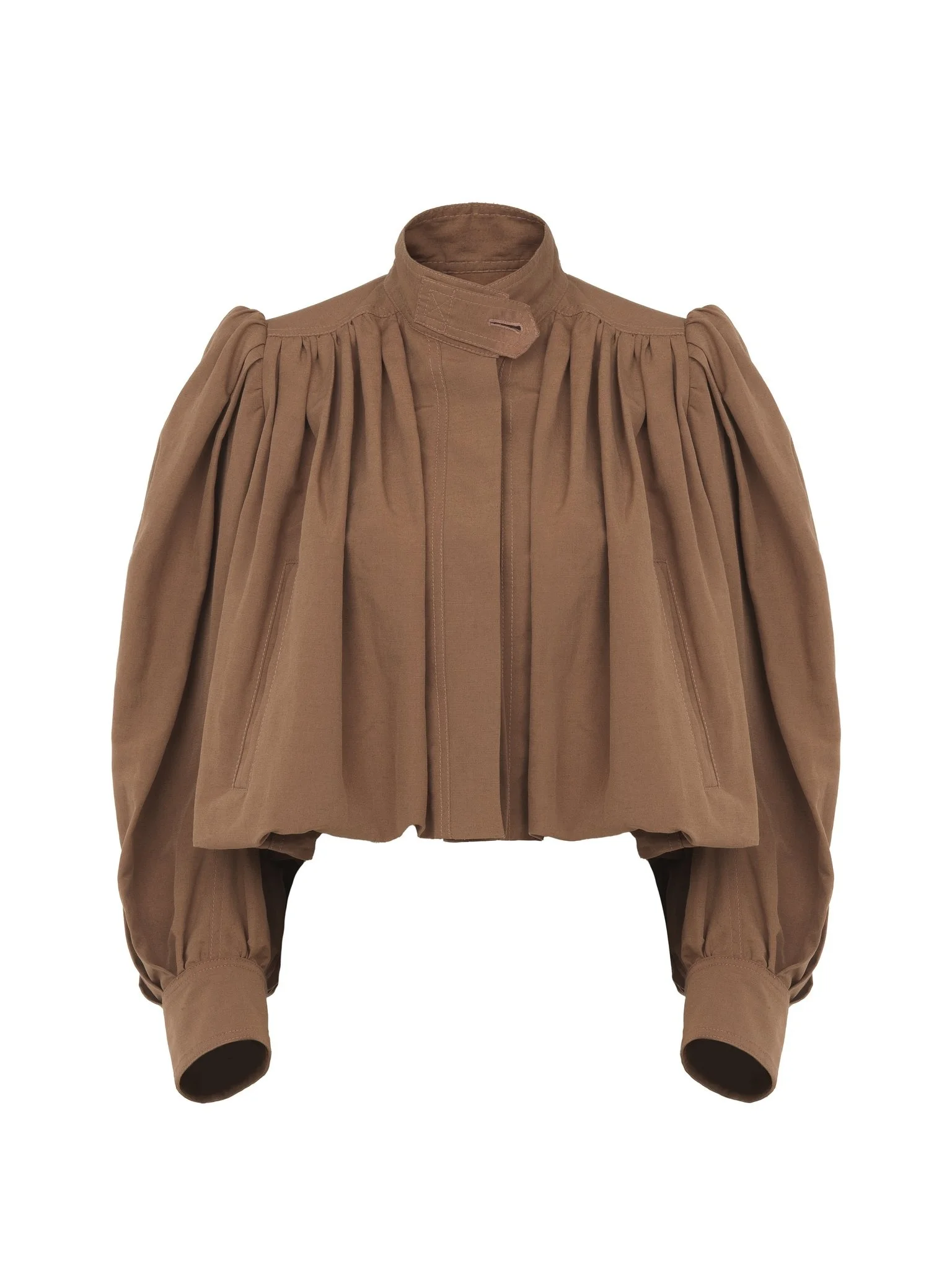 Gathered boule jacket in a slubbed organic cotton and linen mix with a high neck, gathered shoulders and pleated sleeves. Engraved horn buttons finish this piece. PRODUCT DETAILS Gathered boule jacket outer shell: 52% Linen, 48% Cotton Lining: 100% Cotton Buttons: 100% Horn Fit: straight - The model is 5'10" (178 cm) and wears a prototype in size 36 - Pleated-sleeve jacket - Engraved horn buttons through front & at cuffs - Side pockets Care: dry cleaning only An organic cotton farming system sustains the health of soils, ecosystems and people by eliminating the use of toxic and persistent organic pollutants and increasing water conservation. Linen, hemp and ramie cultivations emit less greenhouse gases and require less water compared to other conventional natural fibers, which is why they are considered lower-impact materials by nature. Color: Mustang Brown Item code: CH25UVE21430209