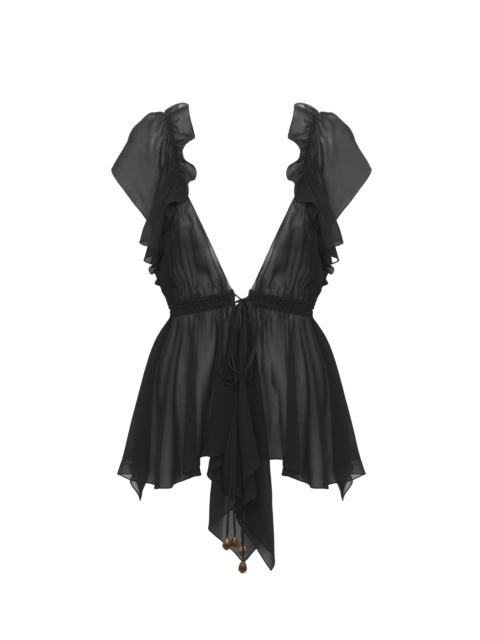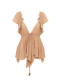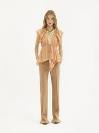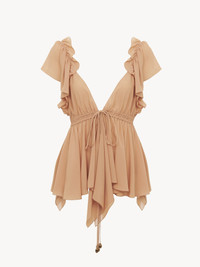Gathered camisole top in silk georgette, featuring hand-made ruches and generous ruffles accentuated by the drawstring empire waist. PRODUCT DETAILS Camisole top outer shell: 100% Silk Care: dry cleaning only Fit: sleeveless, empire shape - The model is 5'10" (178 cm) and wears a prototype in size 36 - Ruffle top - Drawstring waist with metal aglets This product was made in collaboration with Akanjo, a certified WFTO supplier. Akanjo is a social enterprise located in Madagascar that places equal pay and employees' health & wellbeing at the core of their priorities. A long-standing partner of Chloé for 15 years, Akanjo is also committed to training and promoting craftsmanship. Color: Cheek Item code: CH24AHT4100226W
