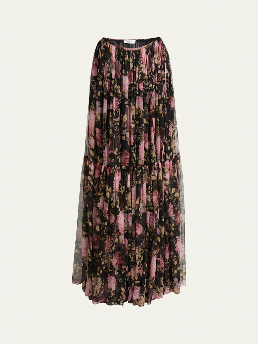 Chloe gathered skirt in organic silk georgette with a floral print Sits high on the waist Maxi length Straight silhouette Side pockets Left-side hook; zipper fastening Side waist tie with hammered metal tips Silk Lining: Acetate/silk Imported Online Inquiries: BGS21_B9WZG| Store Inquiries: #4991554
